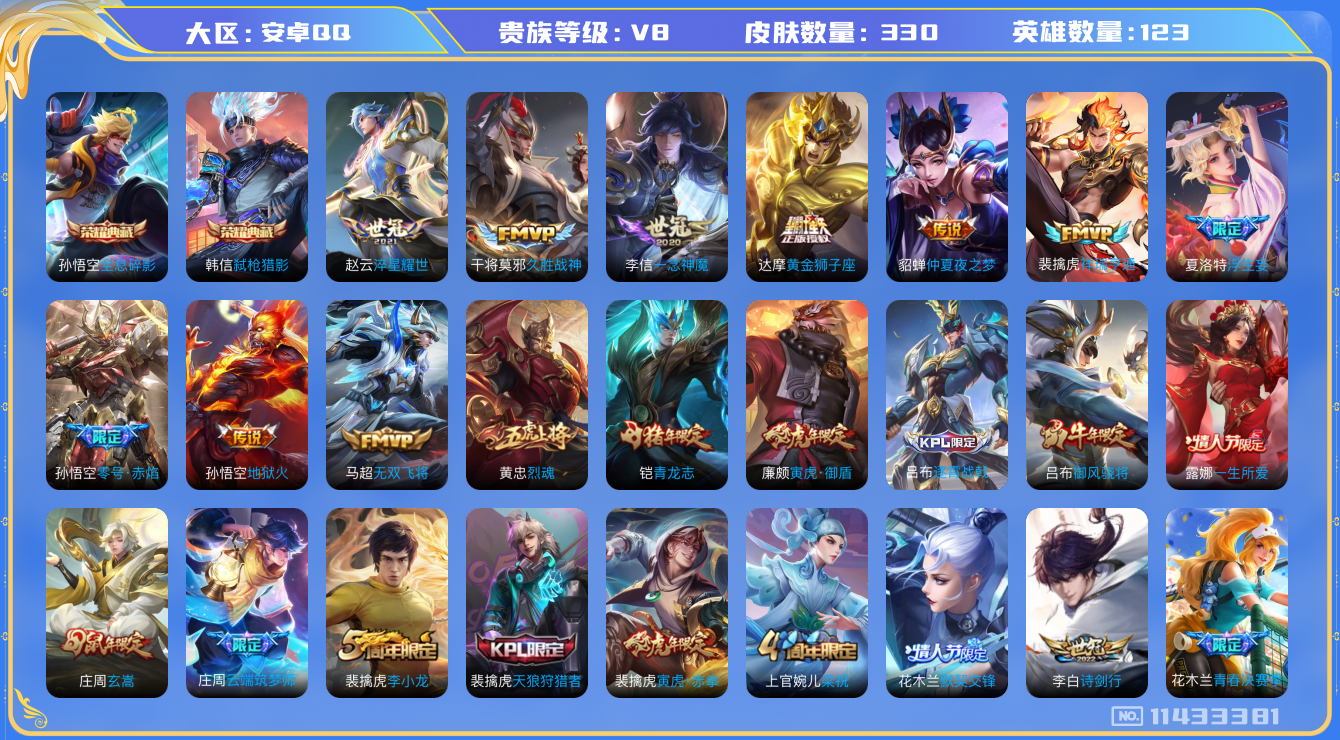 [11433381]V8 2典藏 16传说 123英雄 330皮肤 可修改实名 优质装备:全息碎影(猴子典藏),弑枪猎影(韩信典藏),黄金狮子座,久胜战神,一念神魔,地狱火,仲夏夜之梦(大飞蛾),零号·赤焰,淬星耀世,无双飞将,浮生妄 传说皮:祥瑞亨通 珍宝阁皮:优雅恋人,蔷薇恋人 限定皮:愿照·九州拓(澜年限),逐霄战戟,鸣野蒿,傲雪梅枪,飞衡(韩信年限),玄嵩(庄周年限),诗剑行,五谷丰年,青龙志(铠年限),武圣,梁祝,御风骁将(吕布年限),天狼狩猎者,烈魂,李小龙,朱雀志(守约年限),默契交锋-花木兰,孙行者,一生所爱,引擎之心,青春决赛季,云端筑梦师,美猴王,寅虎·御盾(廉颇年限),寅虎·赤拳(老虎年限),山海·玄木吟(马可年限) 史诗皮:鸭鸭历险记-刘禅,器灵·浮梦炉,化蝶舞,星界战将,龙之律动,茶境仙,破空之剑,蒙犽顽岩魄,炽弈燎原,百相守梦-黄忠,紫霞仙子,电玩小子(小书包),黄金分割率,特工魅影,千年之狐,电玩·爆裂旋风,鹤归松栖(赵怀真),末日机甲-莱西奥,江河有灵,雪夜绮愿(周瑜),百解令(蒙犽),蒙恬荣光圣徽,偶像歌手,冰冠公主,末日机甲-吕布,猫狗日记-孙策,时之恋人-孙尚香,乱世虎臣,修罗,女仆咖啡,摇滚巨星,水果甜心,绅士熊喵,天才门将,星夜王子,心灵骇客,功夫厨神,德古拉伯爵,暗隐猎兽者,幽灵船长,鬼剑武藏,心灵战警,乐园奇幻夜,舞动绿茵,地狱岩魂,纤云弄巧,繁星吟游(呼啦呼啦),拒霜思,缤纷独角兽,乘风破浪,逐浪之夏,水晶猎龙者,曙光守护者,箭羽风息,金属风暴,原初追逐者,圣诞狂欢,圣诞恋歌,鹰眼统帅,王者之锤,暗夜贵公子,赏金猎手,寅虎·御盾,无心,未来纪元-赵云
