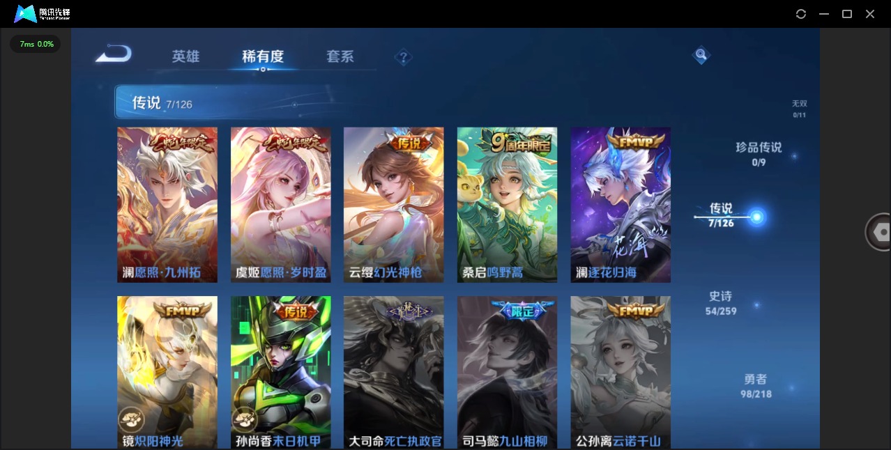 - [12076093]V7 10传说 122英雄 239皮肤 可修改实名 优质装备:云霓雀翎,末日机甲-孙尚香(绿蚂蚱),地狱之眼,超时空战士-狄仁杰,霜月吟,涂山容容 传说皮:九山相柳,祥瑞亨通,幻光神枪 珍宝阁皮:蔷薇恋人 限定皮:逐霄战戟,鸣野蒿,诗剑行,降魔,五谷丰年,岱宗(典韦年限),李小龙 史诗皮:鸭鸭历险记-刘禅,狼魂孤将,绮世丹青,瑰影绮梦,化蝶舞,星界战将,龙之律动,百相守梦-周瑜,茶境仙,破空之剑,琥珀纪元伽罗,蔬乡物语(鲁班七号),百相守梦-百里守约,星界特工,百相守梦-黄忠,紫霞仙子,黄金分割率,江河有灵,百解令(蒙犽),高渐离燃音魔法,冰冠公主,青蛇,偶像歌手,电玩·爆裂旋风,末日机甲-吕布,节奏热浪,女仆咖啡,水果甜心,天才门将,星夜王子,心灵骇客,功夫厨神,德古拉伯爵,暗隐猎兽者,幽灵船长,鬼剑武藏,乐园奇幻夜,地狱岩魂,纤云弄巧,拒霜思,缤纷独角兽,逐浪之夏,水晶猎龙者,金属风暴,圣诞狂欢,圣诞恋歌,鹰眼统帅,魅力维加斯,未来纪元-赵云
