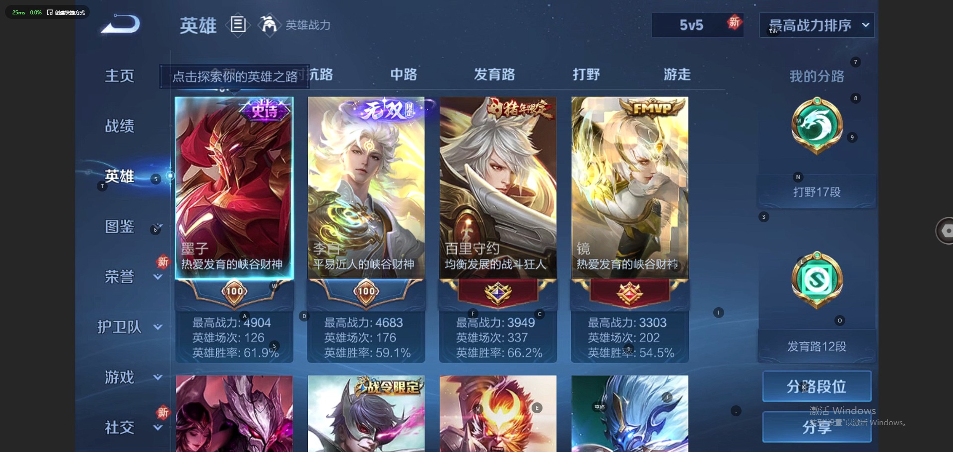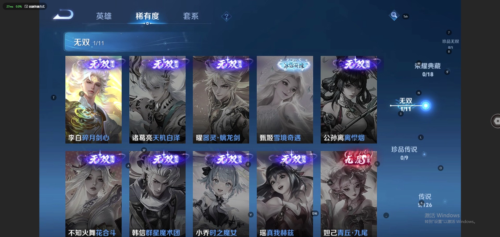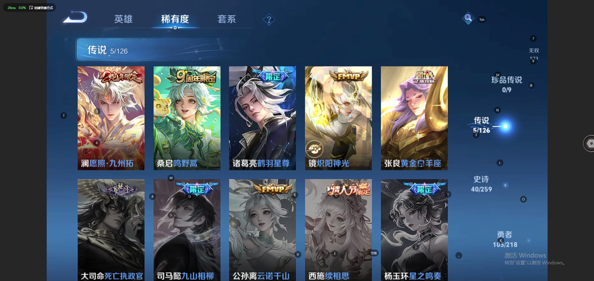- [12087753]V6 1传说 119英雄 98皮肤 可修改实名 限定皮:鸣野蒿,至尊宝,遇见飞天,五谷丰年,冰锋战神,逐梦之影 史诗皮:白龙吟,千年之狐,末日机甲-吕布,水果甜心,绅士熊喵,德古拉伯爵,水晶猎龙者,鹰眼统帅,魅力维加斯