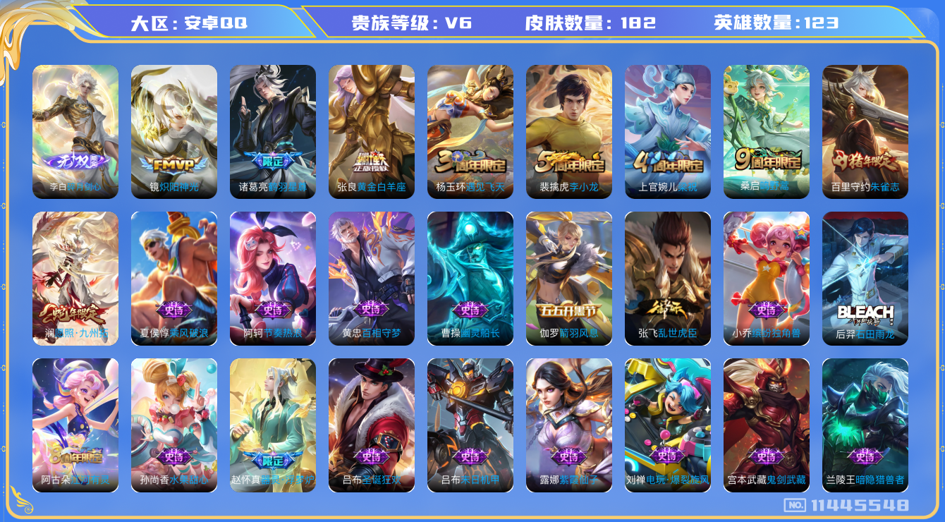 [11445548]V6 1无双 5传说 123英雄 182皮肤 可修改实名 优质装备:碎月剑心(李白无双),黄金白羊座,炽阳神光,鹤羽星尊 珍宝阁皮:万物之道,优雅恋人 限定皮:愿照·九州拓(澜年限),鸣野蒿,遇见飞天,梁祝,李小龙,朱雀志(守约年限) 史诗皮:器灵·浮梦炉,石田雨龙,百相守梦-黄忠,紫霞仙子,电玩·爆裂旋风,江河有灵,百解令(蒙犽),龙骑士(小龙虾),冰冠公主,末日机甲-吕布,乱世虎臣,节奏热浪,水果甜心,心灵骇客,暗隐猎兽者,幽灵船长,鬼剑武藏,心灵战警,缤纷独角兽,乘风破浪,逐浪之夏,水晶猎龙者,箭羽风息,金属风暴,圣诞狂欢,圣诞恋歌,鹰眼统帅,暗夜贵公子,魅力维加斯