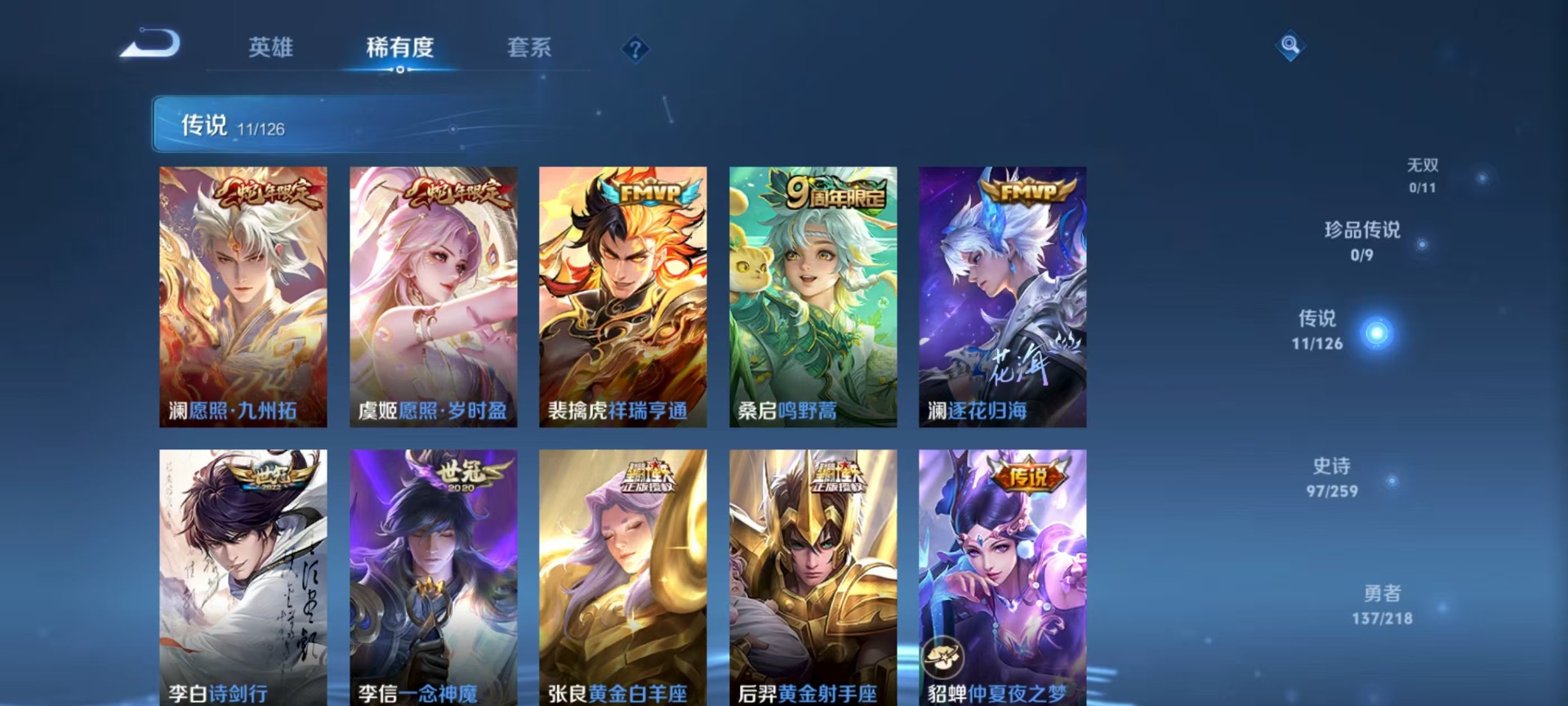 - PX_2111764-Q/至尊星耀/190皮肤/124英雄/1典藏/0珍品无双/0无双/0珍品传说/7传说/45史诗/9稀有英雄 【1 典藏皮肤】神鉴启示录 虞姬, 【7 传说皮肤】记忆之芯 公孙离,乘龙·问璇玑 孙尚香,末日机甲 孙尚香,琥珀纪元 马超,黄金白羊座 张良,幻光神枪 云缨,愿照·岁时盈 虞姬, 【45 史诗皮肤】蔬乡物语 鲁班七号,百解令 蒙犽,乘龙·忆丹青 大乔,暗影游猎 马可波