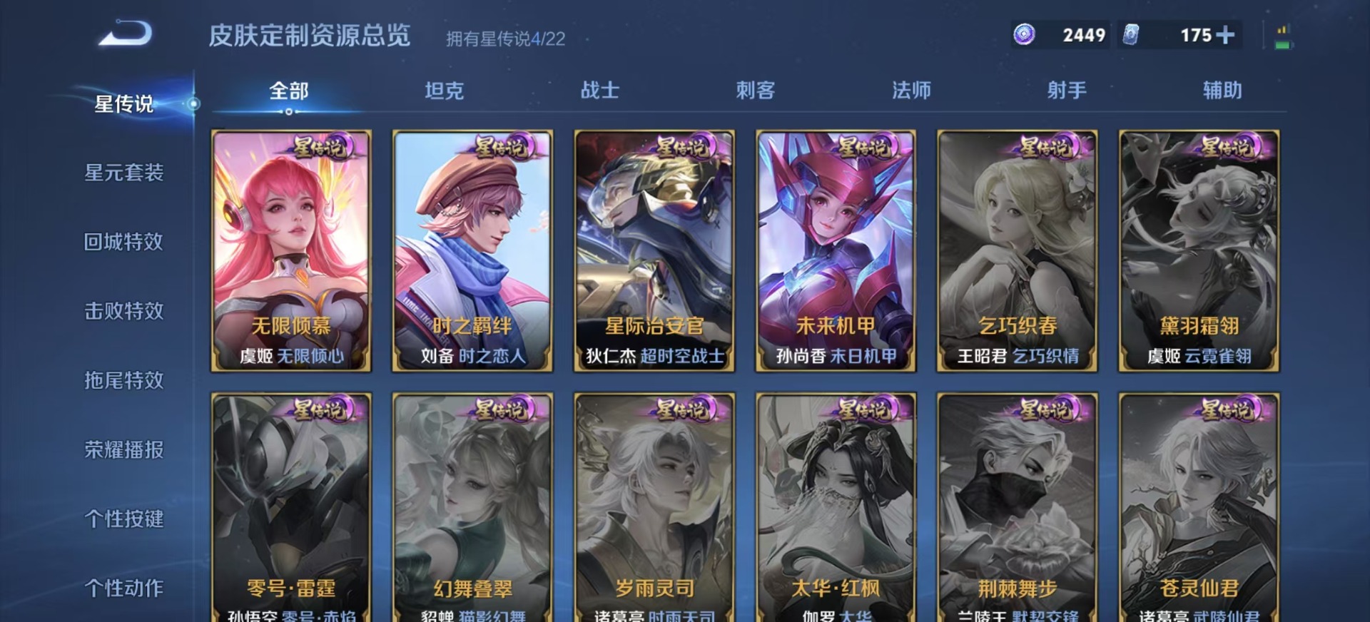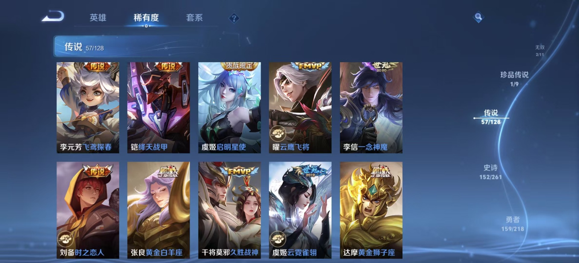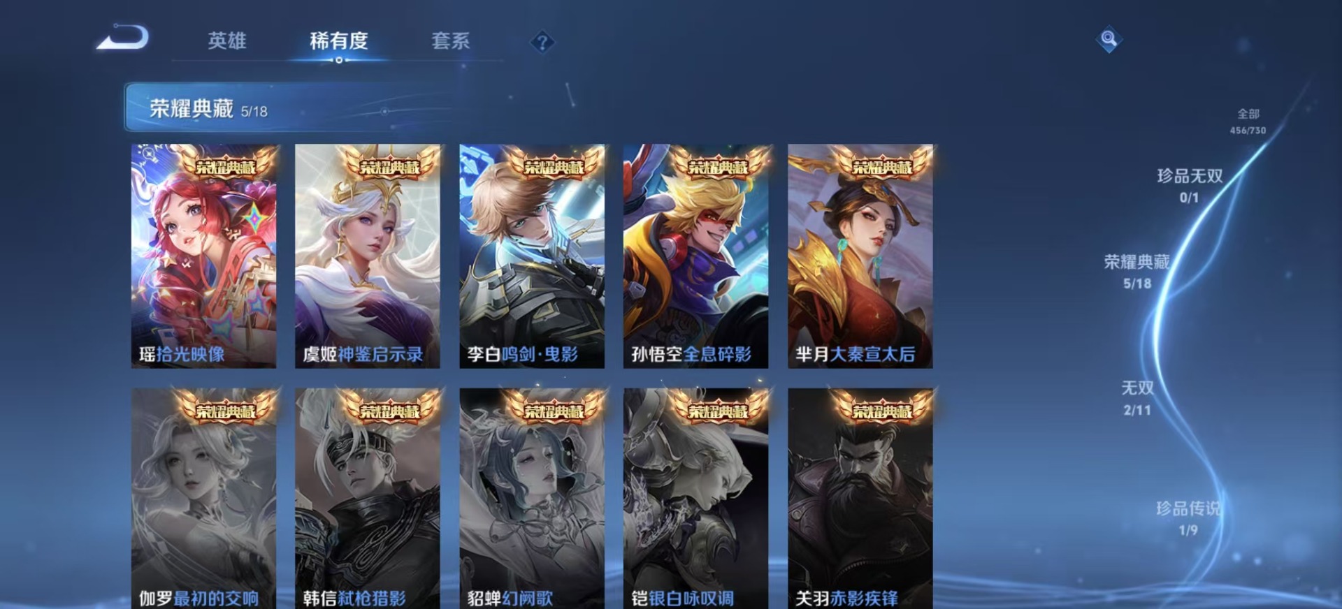 金蝉唐三藏,夏侯惇匿光决锋者,黄忠烈魂,甄姬女儿国国王,盾山梦圆繁星,铠青龙志,苏烈玄武志,张飞虎魄,赵云百木心枪,赵云龙胆,孙膑天狼运算者,孙膑寅虎·展翼,小乔纯白花嫁,孙尚香异界灵契,后羿无尽星芒,后羿如梦令,庄周玄嵩,周瑜真爱至上,杨玉环寅虎·心曲,公孙离玉兔公主,裴擒虎李小龙,裴擒虎天狼狩猎者,裴擒虎寅虎·赤拳,上官婉儿梁祝,上官婉儿神器·万象笔,上官婉儿天狼绘梦者,李白诗剑行,马可波罗山海·玄木吟,艾琳陌上桑,马可波罗深海之息,桑启鸣野蒿,猪八戒猪悟能,女娲愿照·千秋盛,孙悟空孙行者,孙悟空至尊宝,马超神威,雅典娜神奇女侠,妲己愿照·众生和,百里守约朱雀志,墨子降魔,瑶山海·碧波行,虞姬霸王别姬,虞姬愿照·岁时盈,王昭君星穹之声