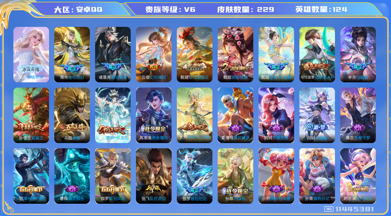 [11445381]V6 1无双 5传说 124英雄 229皮肤 可修改实名 女号 优质装备:雪境奇遇-甄姬,鹤羽星尊,金乌负日,涂山容容 传说皮:幻光神枪 珍宝阁皮:妄想食味 限定皮:愿照·众生和(妲己年限),白晶晶,神威(电光马子),至美·化雀舞,游园惊梦,美猴王,女儿国国王,山海·玄木吟(马可年限) 史诗皮:化蝶舞,星界战将,龙之律动,百相守梦-周瑜,茶境仙,芈月浮光幕影,琥珀纪元伽罗,蔬乡物语(鲁班七号),乘龙·忆丹青(大乔年限),百相守梦-黄忠,织梦人,紫霞仙子,苍穹之光,特工魅影,千年之狐,江河有灵,雪夜绮愿(周瑜),浮梦罗烟,百解令(蒙犽),高渐离燃音魔法,蒙恬荣光圣徽,冰冠公主,偶像歌手,电玩·爆裂旋风,末日机甲-吕布,猫狗日记-孙策,乱世虎臣,节奏热浪,修罗,女仆咖啡,摇滚巨星,水果甜心,星夜王子,心灵骇客,时之奇旅-安琪拉,功夫厨神,暗隐猎兽者,幽灵船长,鬼剑武藏,心灵战警,舞动绿茵,纤云弄巧,拒霜思,缤纷独角兽,乘风破浪,逐浪之夏,水晶猎龙者,曙光守护者,箭羽风息,唤灵魅影,金属风暴,圣诞狂欢,圣诞恋歌,鹰眼统帅,魅力维加斯,未来纪元-赵云