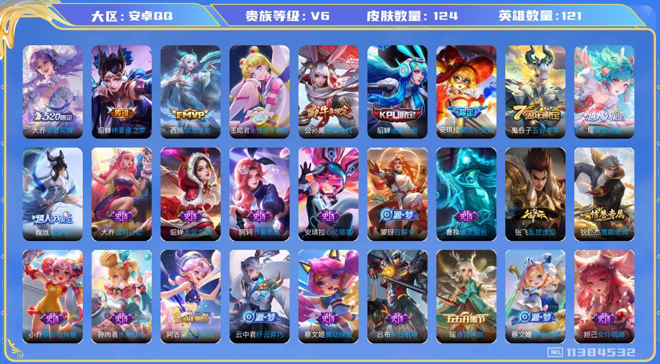 [11384532]V6 6传说 121英雄 124皮肤 可修改实名 优质装备:仲夏夜之梦(大飞蛾),游龙清影(小青龙),挚爱花嫁,永恒水手月亮 珍宝阁皮:蔷薇恋人,女武神 限定皮:魔法小厨娘,五谷丰年,逐梦之音,祈雪灵祝(雪兔子),如梦令-嫦娥,时之祈愿-瑶(瑶传限) 史诗皮:遇见神鹿,江河有灵,百解令(蒙犽),末日机甲-吕布,猫狗日记-大乔,乱世虎臣,节奏热浪,女仆咖啡,水果甜心,心灵骇客,幽灵船长,舞动绿茵,纤云弄巧,繁星吟游(呼啦呼啦),拒霜思,缤纷独角兽,圣诞恋歌,鹰眼统帅,无心