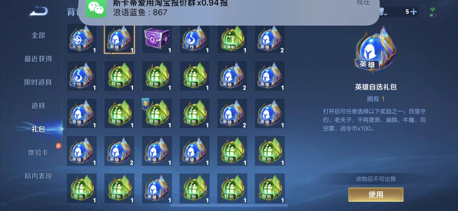 - [11249150]实名: 可修改 贵族等级: V5 英雄数: 123 皮肤数: 187 传说皮: 猫影幻舞 限定皮: 遇见飞天,李小龙,梁祝,冰霜恋舞曲,如梦令-后羿,猪悟能,五谷丰年,鸣野蒿
