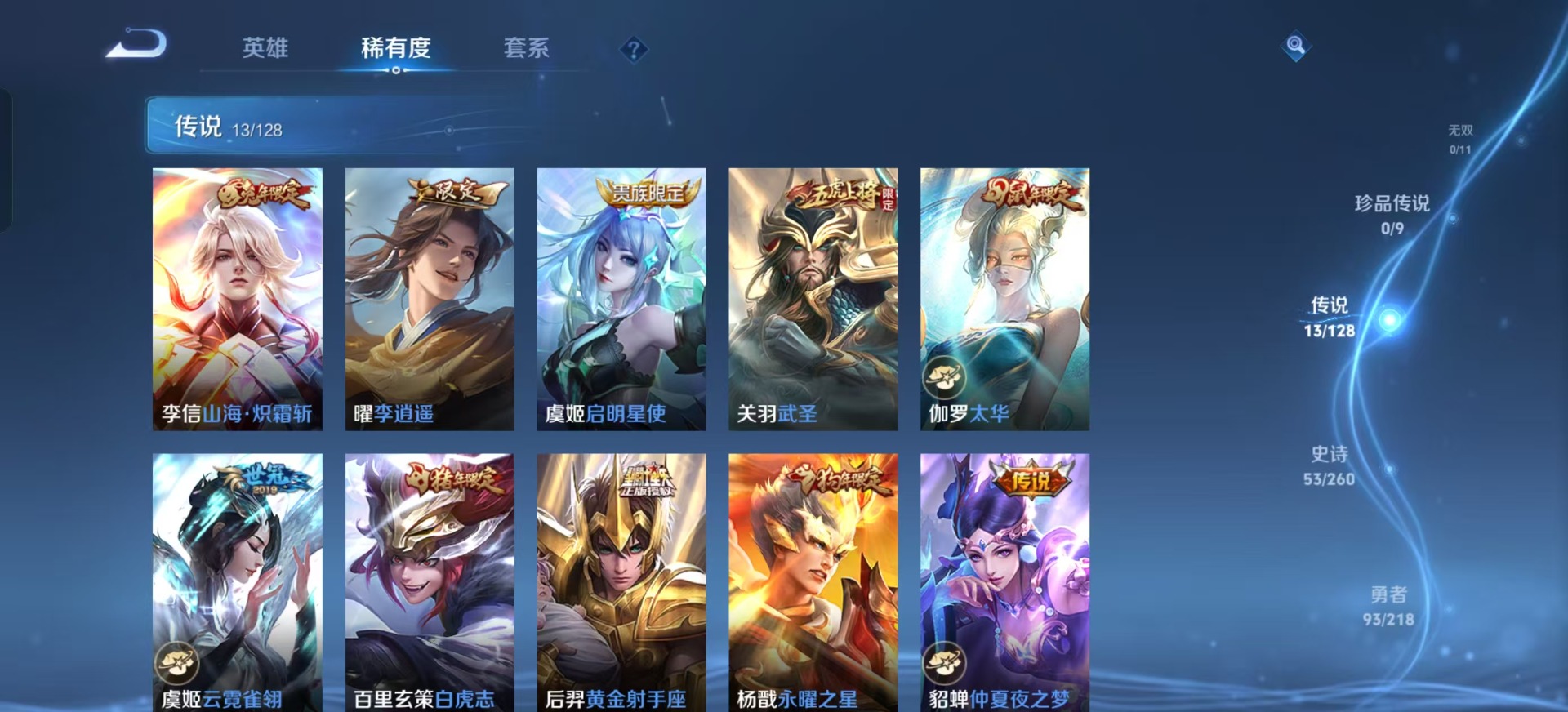 - PX_2101899-Q/非凡王者/273皮肤/125英雄/1典藏/0珍品无双/0无双/3珍品传说/20传说/90史诗/9稀有英雄 【3 珍品传说】朽木白哉 暃,怪盗基德 马可波罗,时之奇旅 孙策, 【1 典藏皮肤】鸣剑·曳影 李白, 【20 传说皮肤】启明星使 虞姬,无双飞将 马超,白虎志 百里玄策,云鹰飞将 曜,地狱之眼 宫本武藏,炽阳神光 镜,黄金射手座 后羿,怒海麟威 吕布,时之恋人 刘备
