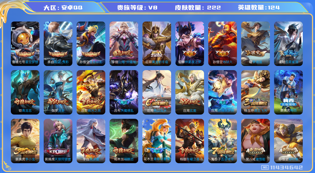 [11434642]V8 3典藏 13传说 124英雄 222皮肤 可修改实名 优质装备:星空梦想(太空人),鸣剑·曳影,全息碎影(猴子典藏),黄金射手座,云霓雀翎,地狱火,仲夏夜之梦(大飞蛾),李逍遥,山海·炽霜斩(李信年限) 珍宝阁皮:万物之道,蔷薇恋人 限定皮:至尊宝,白虎志(电光耗子),凤求凰(白切鸡),太华(伽罗年限),梅西,白晶晶,玄嵩(庄周年限),瑞麟志(木兰年限),遇见飞天,高山流水,五谷丰年,青龙志(铠年限),冰锋战神,武圣,天狼狩猎者,李小龙,逐梦之影,永曜之星,辉光之辰,孙行者,猪悟能,引擎之心,天魔缭乱,青春决赛季,云端筑梦师,美猴王 史诗皮:紫霞仙子,电玩小子(小书包),白龙吟,特工魅影,冰冠公主,偶像歌手,猫狗日记-孙策,乱世虎臣,节奏热浪,水果甜心,天才门将,星夜王子,功夫厨神,德古拉伯爵,暗隐猎兽者,鬼剑武藏,纤云弄巧,繁星吟游(呼啦呼啦),乘风破浪,逐浪之夏,水晶猎龙者,金属风暴,鹰眼统帅,魅力维加斯,未来纪元-赵云