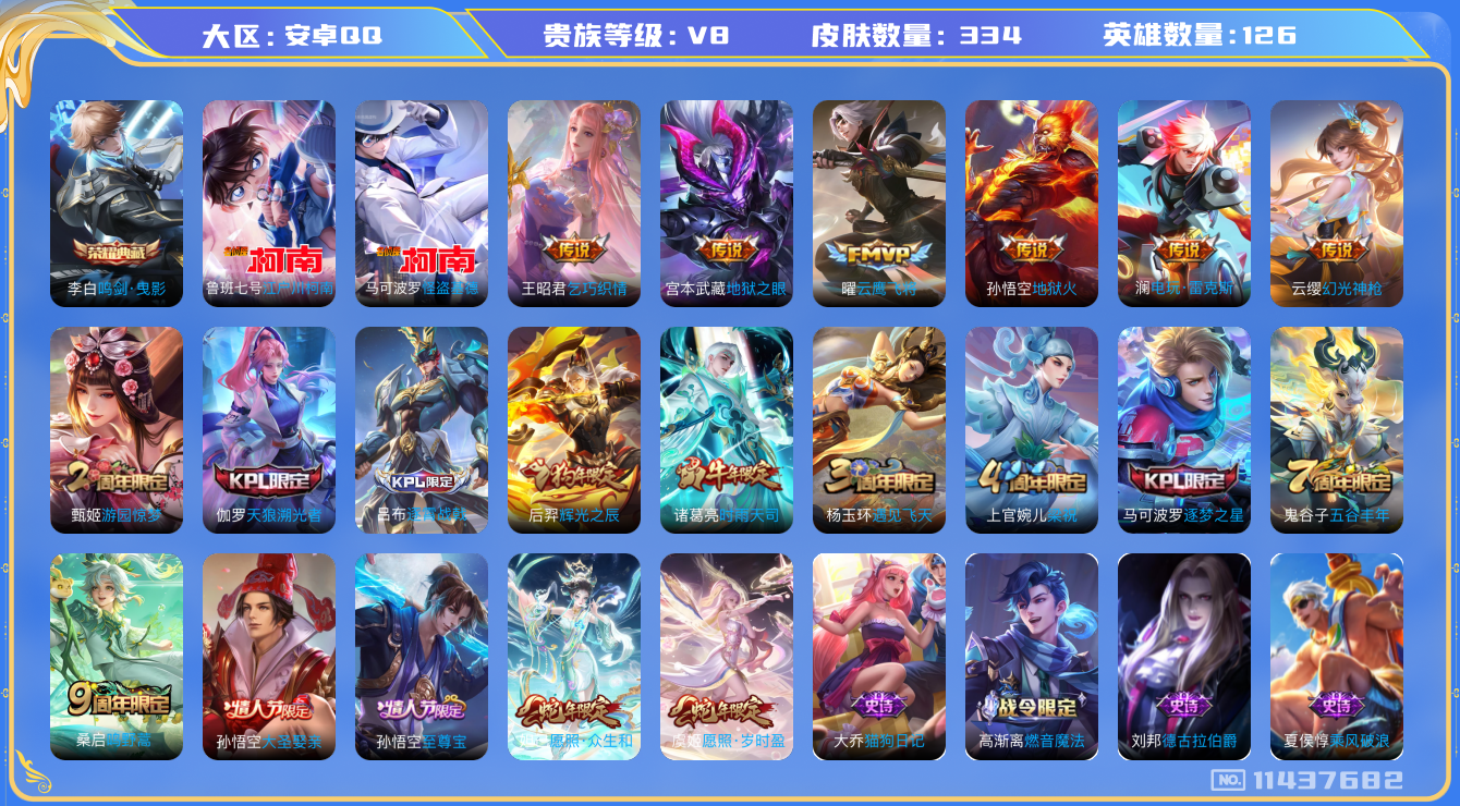 [11437682]V8 1典藏 2珍品传说 11传说 126英雄 334皮肤 典藏英雄武则天 可修改实名 优质装备:鸣剑·曳影,江户川柯南,怪盗基德,云鹰飞将(小将军),地狱火,地狱之眼,乞巧织情,电玩·雷克斯,涂山容容 传说皮:幻光神枪 珍宝阁皮:蔷薇恋人,女武神 限定皮:愿照·岁时盈(虞姬年限),愿照·众生和(妲己年限),逐霄战戟,鸣野蒿,至尊宝,时雨天司(水龙头),遇见飞天,五谷丰年,游园惊梦,梁祝,逐梦之星,天狼溯光者,辉光之辰,大圣娶亲 史诗皮:鸭鸭历险记-刘禅,化蝶舞,灵蛊蚀心,星界战将,龙之律动,石田雨龙,百相守梦-周瑜,茶境仙,破空之剑,蒙犽顽岩魄,蔬乡物语(鲁班七号),百相守梦-百里守约,百相守梦-黄忠,织梦人,遇见神鹿,紫霞仙子,电玩小子(小书包),黄金分割率,特工魅影,千年之狐,江河有灵,魅语,百解令(蒙犽),高渐离燃音魔法,蒙恬荣光圣徽,冰冠公主,青蛇,偶像歌手,电玩·兔顽号,电玩·爆裂旋风,龙骑士(小龙虾),末日机甲-吕布,猫狗日记-孙策,猫狗日记-大乔,时之恋人-孙尚香,乱世虎臣,节奏热浪,女仆咖啡,摇滚巨星,水果甜心,绅士熊喵,天才门将,星夜王子,心灵骇客,功夫厨神,德古拉伯爵,暗隐猎兽者,幽灵船长,鬼剑武藏,心灵战警,乐园奇幻夜,天秀·启明,地狱岩魂,纤云弄巧,繁星吟游(呼啦呼啦),拒霜思,缤纷独角兽,乘风破浪,逐浪之夏,水晶猎龙者,曙光守护者,箭羽风息,金属风暴,圣诞狂欢,圣诞恋歌,鹰眼统帅,暗夜贵公子,魅力维加斯,黎明之约,未来纪元-赵云
