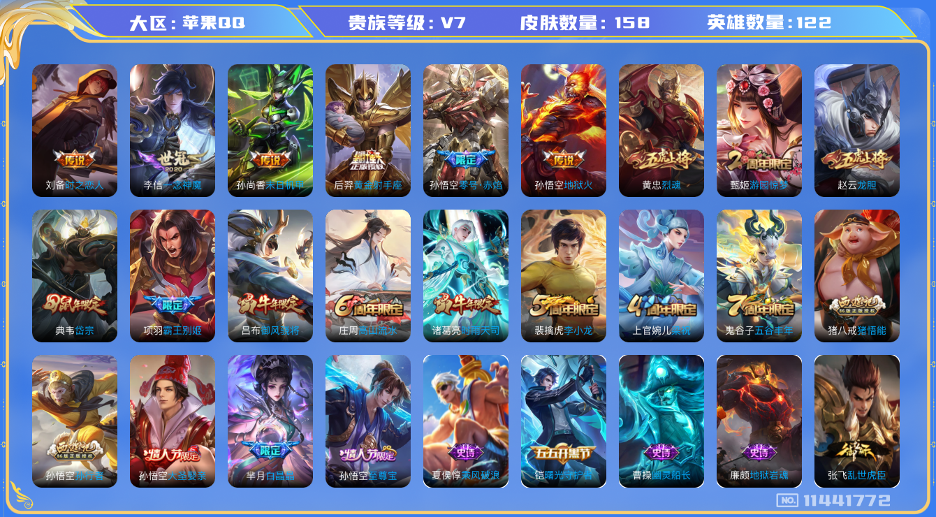 - [11526203]V7 1典藏 8传说 124英雄 282皮肤 可修改实名 优质装备:鸣剑·曳影,末日机甲-孙尚香(绿蚂蚱),地狱之眼,山海·苍雷引(电光曜子),澜逐花归海 传说皮:乘龙·铭钟鼎(赵云年限) 珍宝阁皮:妄想食味,女武神,玩趣恶龙 限定皮:愿照·九州拓(澜年限),逐霄战戟,鸣野蒿,至尊宝,五谷丰年,青龙志(铠年限),游园惊梦,梁祝,天狼狩猎者,李小龙,逐梦之影,默契交锋-花木兰,孙行者,猪悟能,寅虎·赤拳(老虎年限) 史诗皮:星界战将,龙之律动,茶境仙,破空之剑,东方月初,埋骨钱,蔬乡物语(鲁班七号),超元猎域,百相守梦-黄忠,紫霞仙子,电玩小子(小书包),千年之狐,永昼,魅语,高渐离燃音魔法,蒙恬荣光圣徽,冰冠公主,偶像歌手,晚萤,电玩·爆裂旋风,末日机甲-吕布,猫狗日记-孙策,节奏热浪,水果甜心,绅士熊喵,星夜王子,心灵骇客,功夫厨神,德古拉伯爵,暗隐猎兽者,幽灵船长,鬼剑武藏,心灵战警,舞动绿茵,地狱岩魂,纤云弄巧,缤纷独角兽,乘风破浪,逐浪之夏,水晶猎龙者,曙光守护者,箭羽风息,金属风暴,原初追逐者,圣诞狂欢,圣诞恋歌,鹰眼统帅,王者之锤,黎明之约,雪上飞焰,赏金猎手,无心,未来纪元-赵云