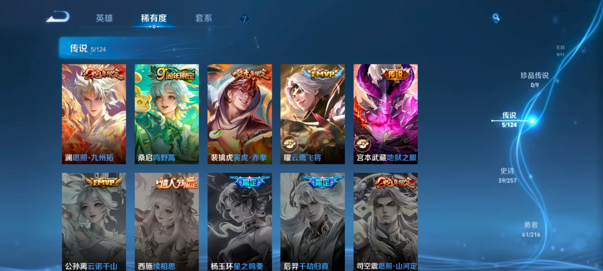- [11884349]V7 2典藏 13传说 125英雄 199皮肤 可修改实名 优质装备:鸣剑·曳影,弑枪猎影(韩信典藏),冠军飞将,云鹰飞将(小将军),炽阳神光,一念神魔,地狱之眼,无双飞将,电玩·雷克斯,澜逐花归海 珍宝阁皮:蔷薇恋人 限定皮:愿照·九州拓(澜年限),愿照·山河定(司空震年限),陌上桑,鸣野蒿,夏侯惇霜北刀,傲雪梅枪,诗剑行,五谷丰年,百木心枪,山海·玄木吟(马可年限) 史诗皮:器灵·浮梦炉,化蝶舞,谪仙醉月,龙之律动,百相守梦-周瑜,茶境仙,撼地雄心,破空之剑,蒙犽顽岩魄,埋骨钱,琥珀纪元伽罗,蔬乡物语(鲁班七号),曹操夜都魔契,百相守梦-黄忠,织梦人,紫霞仙子,苍穹之光,黄金分割率,特工魅影,千年之狐,江河有灵,百解令(蒙犽),高渐离燃音魔法,青蛇,偶像歌手,电玩·爆裂旋风,百相守梦(刘备),暗夜猫娘,末日机甲-吕布,猫狗日记-孙策,猫狗日记-大乔,乱世虎臣,节奏热浪,修罗,女仆咖啡,水果甜心,天才门将,星夜王子,功夫厨神,暗隐猎兽者,幽灵船长,鬼剑武藏,暗渊魔法,地狱岩魂,纤云弄巧,拒霜思,乘风破浪,逐浪之夏,水晶猎龙者,曙光守护者,箭羽风息,金属风暴,圣诞恋歌,鹰眼统帅,魅力维加斯,赏金猎手,未来纪元-赵云