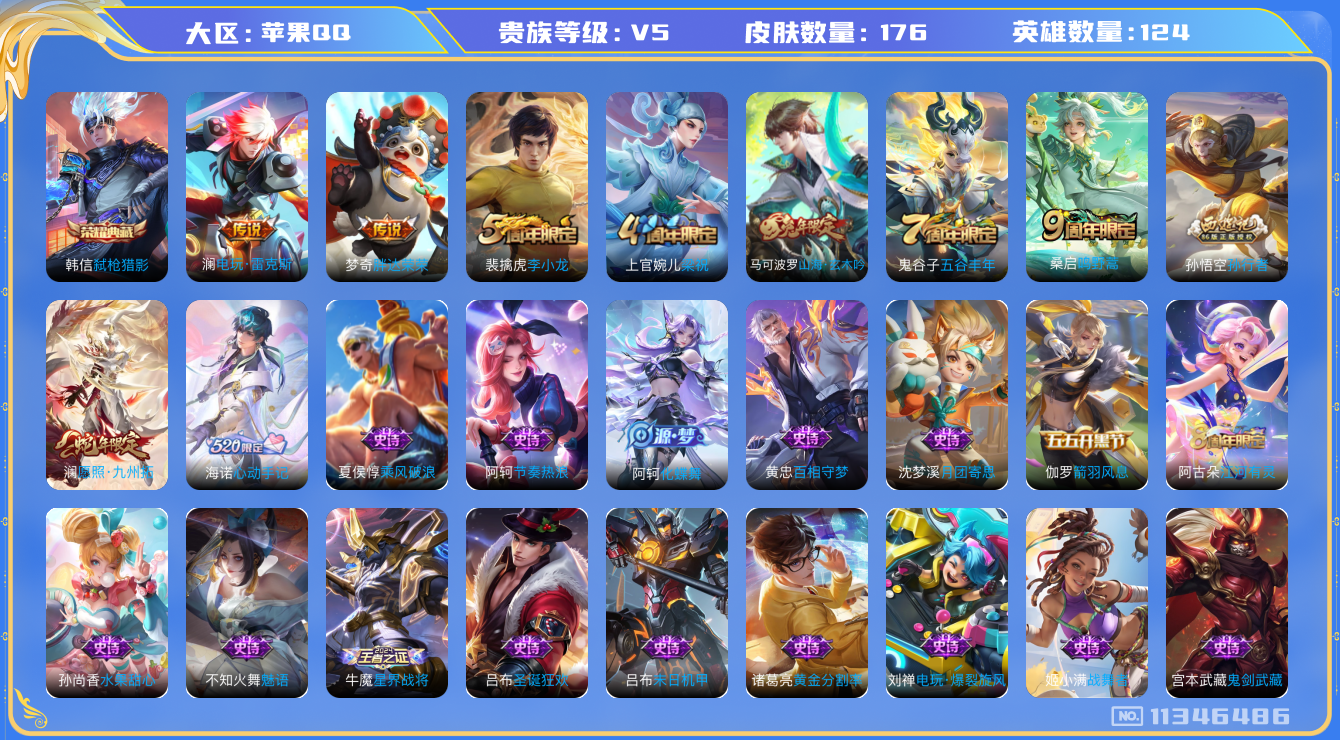 [11346486]V5 1典藏 4传说 124英雄 176皮肤 可修改实名 优质装备:弑枪猎影(韩信典藏),胖达荣荣,电玩·雷克斯 珍宝阁皮:胡桃夹子,女武神 限定皮:愿照·九州拓(澜年限),鸣野蒿,五谷丰年,梁祝,李小龙,孙行者,山海·玄木吟(马可年限) 史诗皮:化蝶舞,星界战将,战舞者,蒙犽顽岩魄,海诺心动手记,百相守梦-黄忠,遇见神鹿,黄金分割率,特工魅影,千年之狐,江河有灵,魅语,蒙恬荣光圣徽,冰冠公主,电玩·爆裂旋风,末日机甲-吕布,节奏热浪,修罗,女仆咖啡,水果甜心,星夜王子,功夫厨神,暗隐猎兽者,鬼剑武藏,心灵战警,纤云弄巧,乘风破浪,月团寄思,水晶猎龙者,箭羽风息,金属风暴,原初追逐者,圣诞狂欢,圣诞恋歌,鹰眼统帅,魅力维加斯,黎明之约