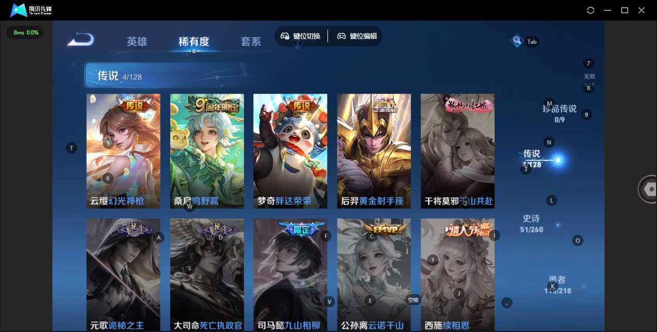 - [11941154]V9 1典藏 23传说 121英雄 334皮肤 可修改实名 优质装备:鸣剑·曳影,云鹰飞将(小将军),黄金白羊座,一念神魔,末日机甲-孙尚香(绿蚂蚱),仲夏夜之梦(大飞蛾),零号·赤焰,淬星耀世,超时空战士-狄仁杰,挚爱之约,挚爱花嫁,山海·炽霜斩(李信年限) 传说皮:乘龙·问璇玑(孙尚香年限),落雪白狼 珍宝阁皮:优雅恋人,女武神 限定皮:白虎志(电光耗子),凤求凰(白切鸡),太华(伽罗年限),梅西,傲雪梅枪,白晶晶,时雨天司(水龙头),神威(电光马子),飞衡(韩信年限),遇见飞天,高山流水,诗剑行,怒海麟威,五谷丰年,冰锋战神,武圣,游园惊梦,梁祝,御风骁将(吕布年限),天狼狩猎者,龙胆,逐梦之星,李小龙,逐梦之影,霸王别姬-虞姬,孙行者,猪悟能,大圣娶亲,引擎之心,天魔缭乱,乒乒小将,匿光追影者,枫霜尽,山海·玄木吟(马可年限) 史诗皮:紫霞仙子,白龙吟,黄金分割率,特工魅影,千年之狐,江河有灵,鹤归松栖(赵怀真),魅语,蒙恬荣光圣徽,无限星赏官,偶像歌手,晚萤,暗夜猫娘,龙骑士(小龙虾),末日机甲-吕布,乱世虎臣,修罗,女仆咖啡,水果甜心,绅士熊喵,天才门将,星夜王子,功夫厨神,暗隐猎兽者,幽灵船长,鬼剑武藏,心灵战警,舞动绿茵,地狱岩魂,纤云弄巧,缤纷独角兽,乘风破浪,逐浪之夏,水晶猎龙者,曙光守护者,热力回旋,箭羽风息,金属风暴,原初追逐者,圣诞狂欢,圣诞恋歌,鹰眼统帅,魅力维加斯,黎明之约,赏金猎手,无心