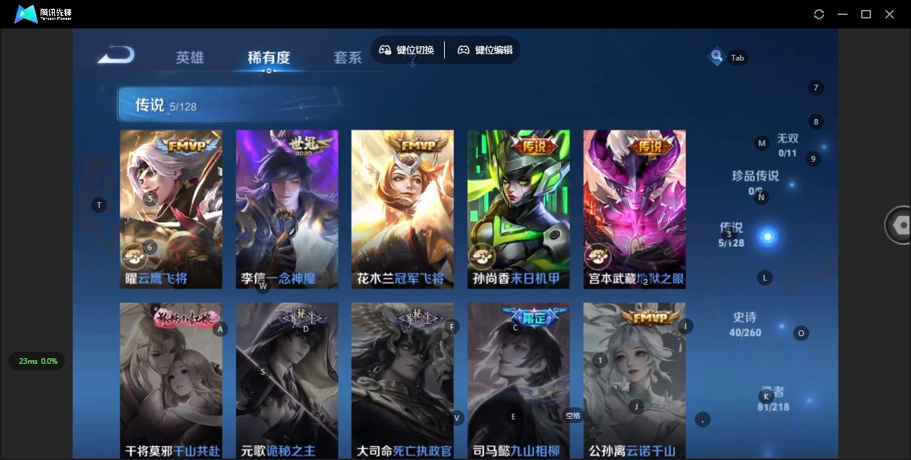 - PX_2095932-实名: 可修改 贵族等级: V4 英雄数: 45 皮肤数: 23 传说皮: 幻光神枪,续相思 限定皮: 愿照·福禄聚