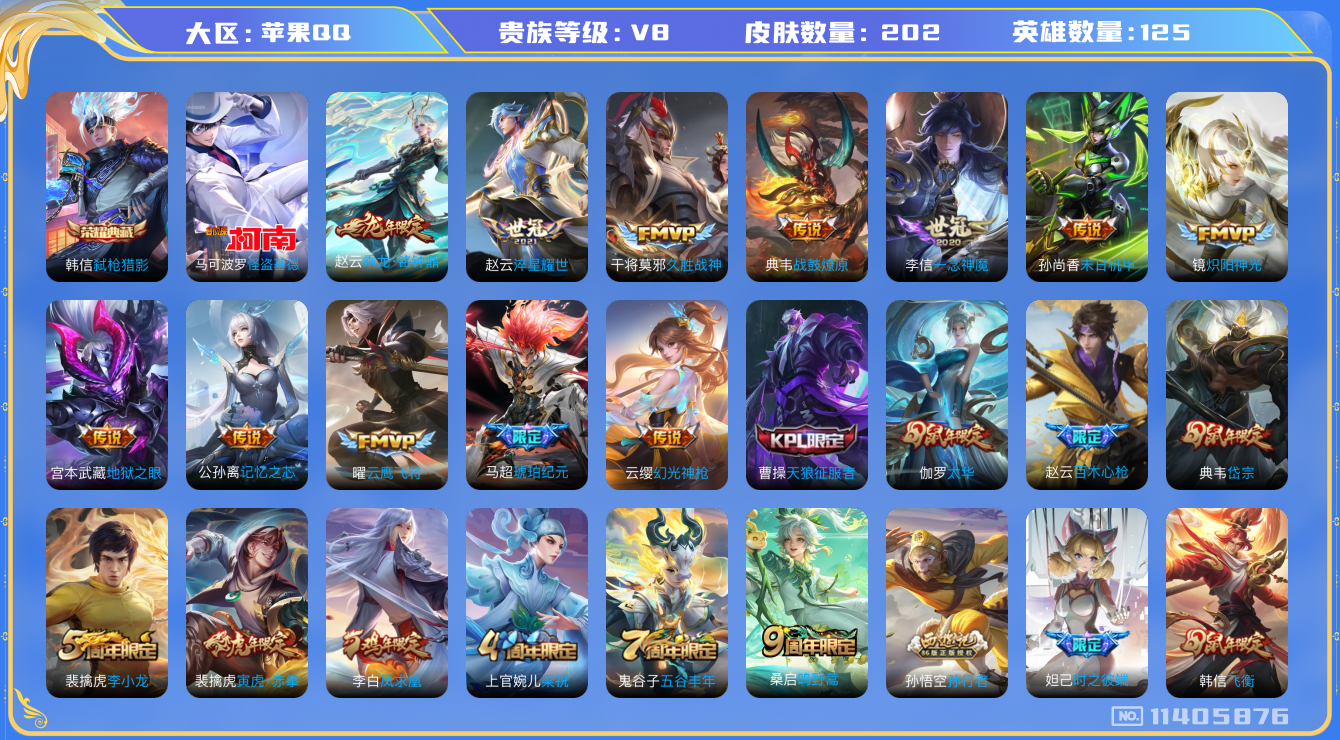 [11405876]V8 1典藏 1珍品传说 17传说 125英雄 202皮肤 可修改实名 优质装备:弑枪猎影(韩信典藏),怪盗基德,云鹰飞将(小将军),久胜战神,炽阳神光,一念神魔,末日机甲-孙尚香(绿蚂蚱),地狱之眼,淬星耀世,记忆之芯(机甲兔),琥珀纪元马超 传说皮:乘龙·铭钟鼎(赵云年限),典韦战鼓燎原,幻光神枪 珍宝阁皮:妄想食味 限定皮:鸣野蒿,凤求凰(白切鸡),太华(伽罗年限),时之彼端,飞衡(韩信年限),五谷丰年,梁祝,岱宗(典韦年限),天狼征服者,李小龙,孙行者,寅虎·赤拳(老虎年限),百木心枪 史诗皮:星界战将,破空之剑,东方月初,埋骨钱,百相守梦-百里守约,星界特工,百相守梦-黄忠,紫霞仙子,特工魅影,千年之狐,真我赫兹(镜),百解令(蒙犽),高渐离燃音魔法,偶像歌手,猫狗日记-孙策,猫狗日记-大乔,乱世虎臣,节奏热浪,摇滚巨星,水果甜心,星夜王子,心灵骇客,德古拉伯爵,暗隐猎兽者,幽灵船长,鬼剑武藏,暗渊魔法,心灵战警,舞动绿茵,地狱岩魂,纤云弄巧,拒霜思,缤纷独角兽,逐浪之夏,水晶猎龙者,曙光守护者,箭羽风息,金属风暴,原初追逐者,圣诞狂欢,圣诞恋歌,鹰眼统帅,魅力维加斯,无心,未来纪元-赵云