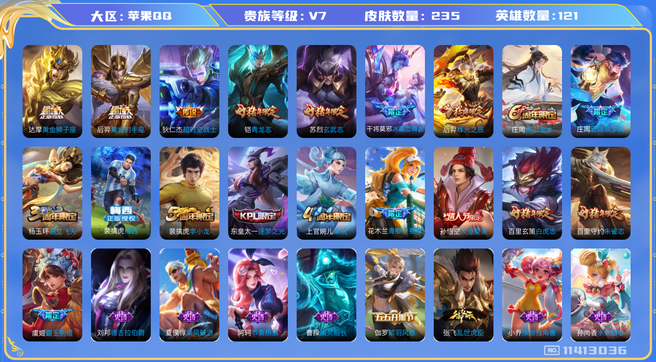 [11413036]V7 4传说 121英雄 235皮肤 可修改实名 优质装备:黄金狮子座,黄金射手座,超时空战士-狄仁杰 珍宝阁皮:蔷薇恋人 限定皮:白虎志(电光耗子),梅西,遇见飞天,高山流水,青龙志(铠年限),梁祝,李小龙,逐梦之光,玄武志(苏烈年限),朱雀志(守约年限),辉光之辰,霸王别姬-虞姬,大圣娶亲,青春决赛季,冰霜恋舞曲,云端筑梦师 史诗皮:紫霞仙子,苍穹之光,电玩小子(小书包),白龙吟,黄金分割率,特工魅影,千年之狐,无限星赏官,偶像歌手,乱世虎臣,节奏热浪,修罗,女仆咖啡,水果甜心,天才门将,星夜王子,心灵骇客,功夫厨神,德古拉伯爵,暗隐猎兽者,幽灵船长,鬼剑武藏,纤云弄巧,繁星吟游(呼啦呼啦),缤纷独角兽,乘风破浪,逐浪之夏,箭羽风息,金属风暴,原初追逐者,圣诞狂欢,圣诞恋歌,鹰眼统帅,暗夜贵公子,魅力维加斯,黎明之约