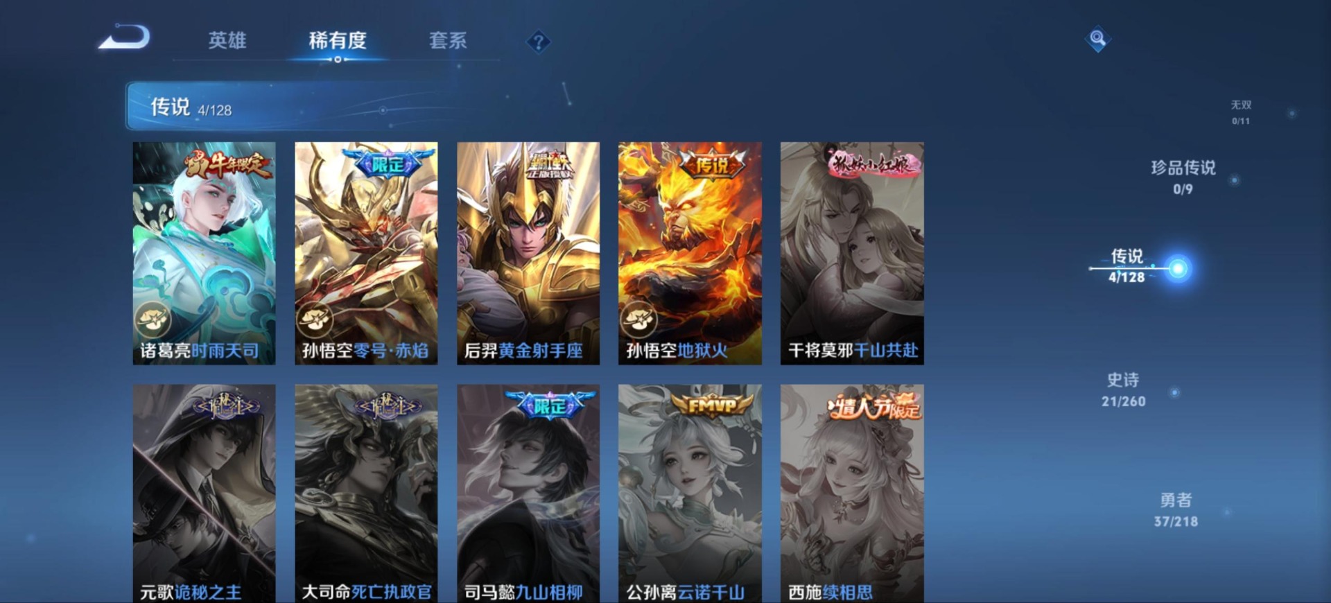 - [11520531]V8 1典藏 1无双 2珍品传说 12传说 124英雄 241皮肤 可修改实名 优质装备:小乔时之魔女(小乔无双),最初的交响(伽罗典藏),黄金射手座,久胜战神,一念神魔,末日机甲-孙尚香(绿蚂蚱),李逍遥,游龙清影(小青龙),淬星耀世 珍品传说:时之奇旅-孙策,兔狲·蓬尾 传说皮:幻光神枪 珍宝阁皮:优雅恋人,玩趣恶龙 限定皮:愿照·九州拓(澜年限),逐霄战戟,凤求凰(白切鸡),神威(电光马子),遇见飞天,高山流水,青龙志(铠年限),武圣,游园惊梦,梁祝,御风骁将(吕布年限),天狼狩猎者,逐梦之星,岱宗(典韦年限),李小龙,朱雀志(守约年限),默契交锋-花木兰,猪悟能,一生所爱,大圣娶亲,青春决赛季,蜜橘之夏,美猴王 史诗皮:鸭鸭历险记-刘禅,器灵·浮梦炉,瑰影绮梦,化蝶舞,龙之律动,茶境仙,白龙吟,黄金分割率,千年之狐,偶像歌手,龙骑士(小龙虾),暗夜猫娘,魅语,无限星赏官,冰冠公主,节奏热浪,修罗,水果甜心,星夜王子,功夫厨神,德古拉伯爵,暗隐猎兽者,幽灵船长,鬼剑武藏,心灵战警,舞动绿茵,地狱岩魂,纤云弄巧,乘风破浪,逐浪之夏,水晶猎龙者,箭羽风息,金属风暴,原初追逐者,圣诞狂欢,圣诞恋歌,鹰眼统帅,魅力维加斯,无心,未来纪元-赵云