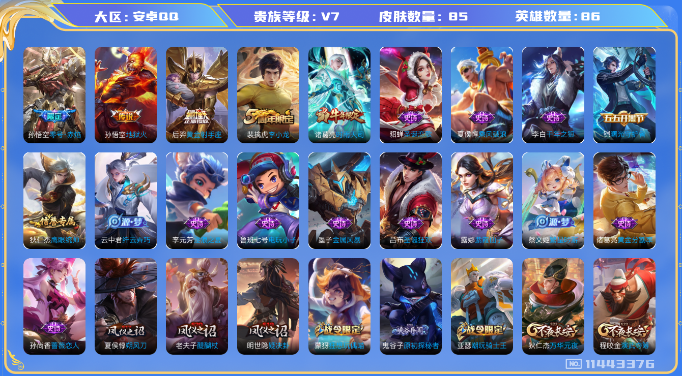 - [12086274]V7 1典藏 1珍品传说 6传说 124英雄 208皮肤 可修改实名 优质装备:无限飓风号(高达),冠军飞将,地狱火,末日机甲-孙策 珍品传说:时之奇旅-孙策 传说皮:乘龙·淬吴钩(孙策年限),吕布曦玄引 珍宝阁皮:玩趣恶龙 限定皮:逐霄战戟,怒海麟威,五谷丰年,梁祝,李小龙,寅虎·御盾(廉颇年限) 史诗皮:赞萌露比,鸭鸭历险记-刘禅,星界战将,龙之律动,小牛鸭,百相守梦-周瑜,百相守梦-百里守约,特工魅影,高渐离燃音魔法,蒙恬荣光圣徽,晚萤,末日机甲-吕布,猫狗日记-孙策,乱世虎臣,节奏热浪,摇滚巨星,水果甜心,天才门将,星夜王子,功夫厨神,德古拉伯爵,暗隐猎兽者,幽灵船长,鬼剑武藏,乐园奇幻夜,地狱岩魂,纤云弄巧,拒霜思,缤纷独角兽,乘风破浪,逐浪之夏,水晶猎龙者,金属风暴,原初追逐者,鹰眼统帅,魅力维加斯,黎明之约,寅虎·御盾,未来纪元-赵云