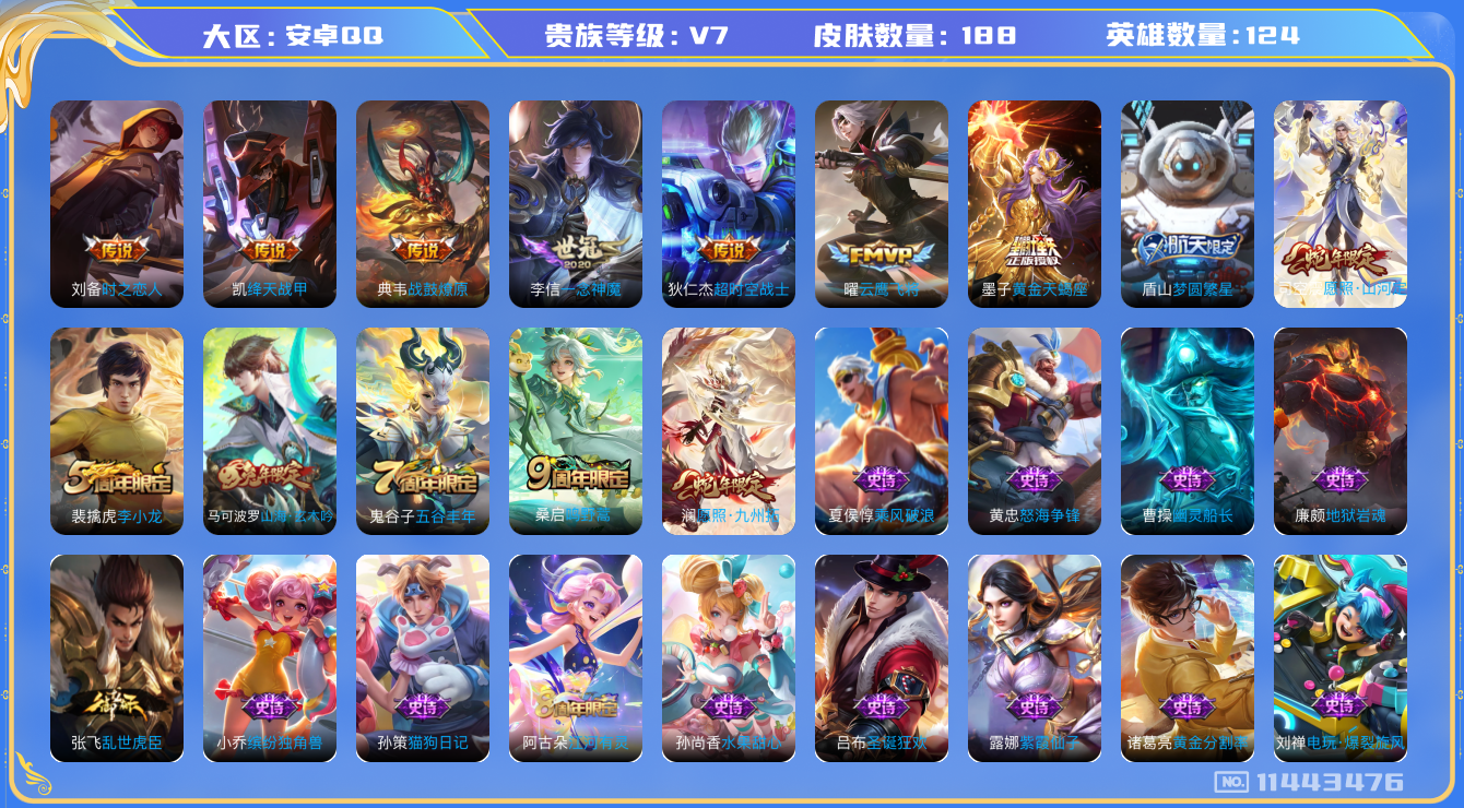 - [12089656]V7 1典藏 1珍品传说 9传说 123英雄 242皮肤 可修改实名 优质装备:鸣剑·曳影,怪盗基德,云鹰飞将(小将军),炽阳神光,一念神魔,末日机甲-孙尚香(绿蚂蚱),山海·炽霜斩(李信年限),澜逐花归海 传说皮:幻光神枪 珍宝阁皮:玩趣恶龙 限定皮:愿照·九州拓(澜年限),逐霄战戟,鸣野蒿,飞衡(韩信年限),至美·乘鲤谣,五谷丰年,匿光追影者 史诗皮:器灵·浮梦炉,星界战将,茶境仙,破空之剑,战舞者,蒙犽顽岩魄,琥珀纪元伽罗,蔬乡物语(鲁班七号),乘龙·忆丹青(大乔年限),百相守梦-百里守约,星界特工,紫霞仙子,黄金分割率,特工魅影,千年之狐,江河有灵,雪夜绮愿(周瑜),魅语,百解令(蒙犽),高渐离燃音魔法,白蛇,电玩·爆裂旋风,猫狗日记-孙策,乱世虎臣,节奏热浪,修罗,女仆咖啡,摇滚巨星,水果甜心,绅士熊喵,星夜王子,德古拉伯爵,暗隐猎兽者,幽灵船长,鬼剑武藏,暗渊魔法,乐园奇幻夜,天秀·启明,舞动绿茵,地狱岩魂,纤云弄巧,拒霜思,缤纷独角兽,乘风破浪,逐浪之夏,水晶猎龙者,曙光守护者,热力回旋,金属风暴,原初追逐者,圣诞狂欢,圣诞恋歌,鹰眼统帅,魅力维加斯,赏金猎手,天秀·音浪,无心,未来纪元-赵云,玫瑰异探