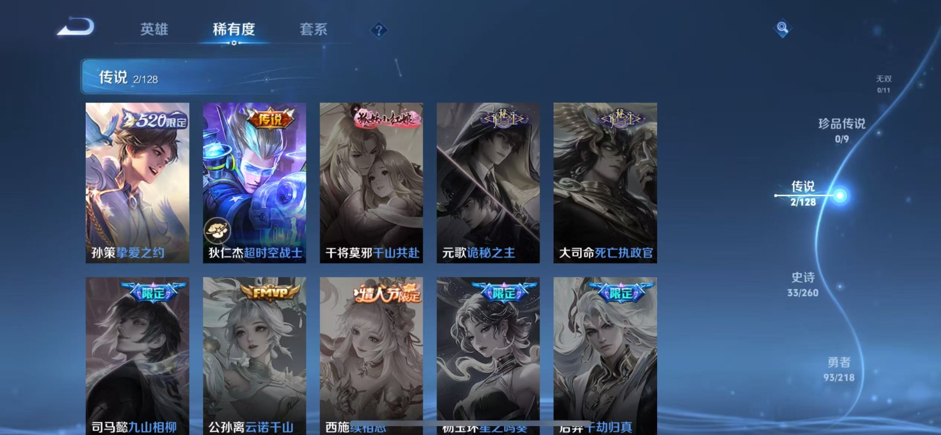 - PX_2103124-Q/非凡王者/246皮肤/126英雄/3典藏/0珍品无双/0无双/2珍品传说/13传说/60史诗/10稀有英雄 【2 珍品传说】酷洛米之心 安琪拉,黑崎一护 宫本武藏, 【3 典藏皮肤】全息碎影 孙悟空,弑枪猎影 韩信,大秦宣太后 芈月, 【13 传说皮肤】启明星使 虞姬,无双飞将 马超,白虎志 百里玄策,云鹰飞将 曜,地狱之眼 宫本武藏,武陵仙君 诸葛亮,海洋之心 武则天,