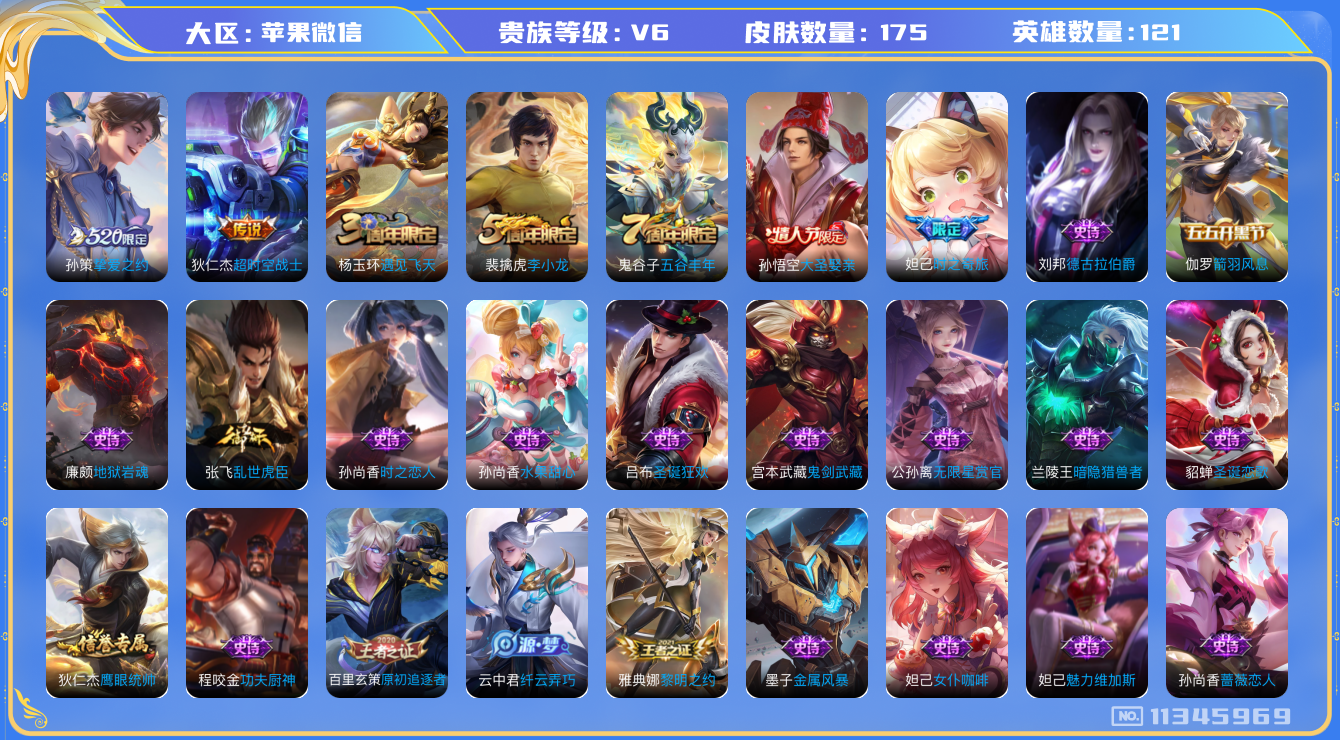 [11345969]V6 2传说 121英雄 175皮肤 可修改实名 社交场景限制 优质装备:超时空战士-狄仁杰,挚爱之约 珍宝阁皮:蔷薇恋人 限定皮:遇见飞天,五谷丰年,李小龙,大圣娶亲,时之奇旅-妲己 史诗皮:无限星赏官,时之恋人-孙尚香,乱世虎臣,女仆咖啡,水果甜心,功夫厨神,德古拉伯爵,暗隐猎兽者,鬼剑武藏,地狱岩魂,纤云弄巧,箭羽风息,金属风暴,原初追逐者,圣诞狂欢,圣诞恋歌,鹰眼统帅,魅力维加斯,黎明之约