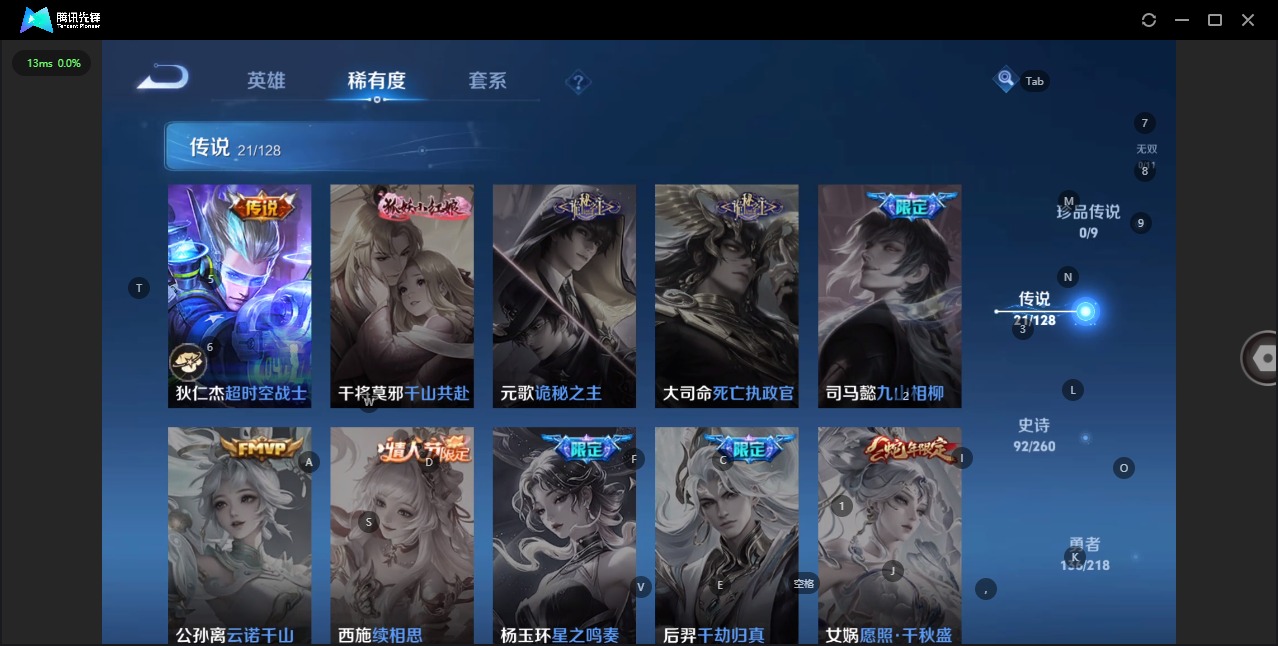 - [12146154]V10 2典藏 1珍品无双 1无双 3珍品传说 51传说 126英雄 437皮肤 典藏英雄武则天 可修改实名 优质装备:馥梦繁花,全息碎影(猴子典藏),弑枪猎影(韩信典藏),天机白泽,器灵·落星盏,酷洛米之心,大耳狗之梦,黄金狮子座,黄金射手座,云鹰飞将(小将军),绛天战甲(鸡嘴战神),黄金白羊座,猫影幻舞,久胜战神,炽阳神光,一念神魔,末日机甲-孙尚香(绿蚂蚱),地狱火,仲夏夜之梦(大飞蛾),海洋之心,地狱之眼,飞鸢探春,音你心动-周瑜,乞巧织情,时之恋人-刘备(电焊工),游龙清影(小青龙),淬星耀世,超时空战士-狄仁杰,末日机甲-孙策,无双飞将,碎云,电玩·雷克斯,灼幽烈阳,妄想实况,妄想奇谈,霜月吟,澜逐花归海,艾琳觅芳踪,牧神诗旅,涂山容容 传说皮:落雪白狼,九山相柳,续相思,祥瑞亨通,幻光神枪 珍宝阁皮:妄想食味,女武神,玩趣恶龙 限定皮:愿照·九州拓(澜年限),愿照·福禄聚(蔡文姬年限),愿照·岁时盈(虞姬年限),愿照·山河定(司空震年限),愿照·众生和(妲己年限),愿照·千秋盛(女娲年限),鸣野蒿,夏侯惇霜北刀,至尊宝,武陵仙君(小桃花),傲雪梅枪,寅虎·展翼(孙膑年限),魔法小厨娘,时雨天司(水龙头),遇见飞天,高山流水,诗剑行,齐天大圣,怒海麟威,五谷丰年,冰锋战神,游园惊梦,梁祝,岱宗(典韦年限),李小龙,逐梦之影,朱雀志(守约年限),孙行者,大圣娶亲,寅虎·御盾(廉颇年限),时之奇旅-妲己 史诗皮:鸭鸭历险记-刘禅,飞车小橘子,苍鳞隐世,器灵·浮梦炉,狼魂孤将,绮世丹青,灵蛊蚀心,星界战将,龙之律动,雪豹·霜爪,藏狐·褐绒,小牛鸭,石田雨龙,百相守梦-周瑜,戍鼓铭心,茶境仙,幻珠鲛人,破空之剑,琥珀纪元伽罗,奇遇星旅,蔬乡物语(鲁班七号),星界特工,百相守梦-黄忠,遇见神鹿,紫霞仙子,苍穹之光,电玩小子(小书包),黄金分割率,特工魅影,千年之狐,永昼,江河有灵,末日机甲-莱西奥,真我赫兹(百里守约),浮梦罗烟,闲日渔趣,魅语,百解令(蒙犽),高渐离燃音魔法,蒙恬荣光圣徽,无限星赏官,冰冠公主,青蛇,偶像歌手,白蛇,晚萤,电玩·爆裂旋风,暗夜猫娘,银翎春语,龙骑士(小龙虾),末日机甲-吕布,猫狗日记-孙策,猫狗日记-大乔,时之恋人-孙尚香,乱世虎臣,节奏热浪,修罗,女仆咖啡,摇滚巨星,水果甜心,绅士熊喵,天才门将,星夜王子,心灵骇客,功夫厨