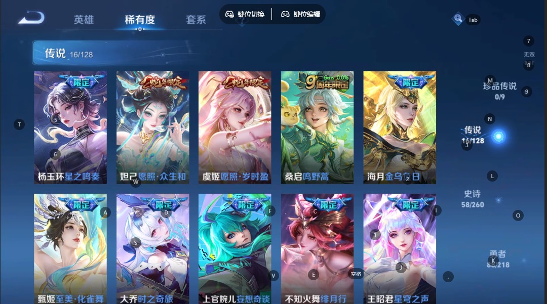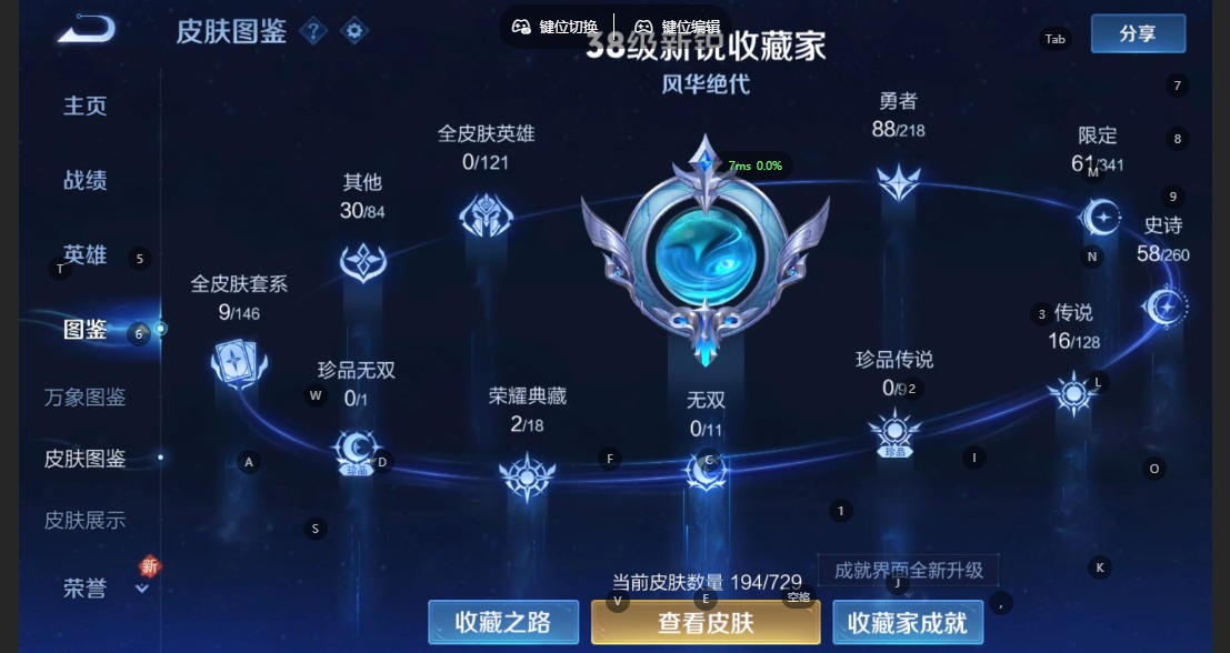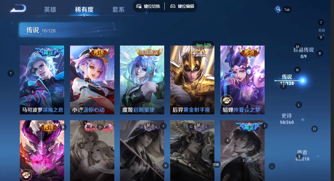 - PX_2095395-99 安卓QQ/至尊星耀/216皮肤/124英雄/2典藏/0珍品无双/0无双/1珍品传说/16传说/74史诗/8稀有英雄 【1 珍品传说】怪盗基德 马可波罗, 【2 典藏皮肤】银白咏叹调 铠,最初的交响 伽罗, 【16 传说皮肤】逐花归海 澜,浮生妄 夏洛特,祈雪灵祝 公孙离,黄金射手座 后羿,久胜战神 干将莫邪,山海·炽霜斩 李信,音你心动 小乔,妄想奇谈 上官婉儿,妄想实