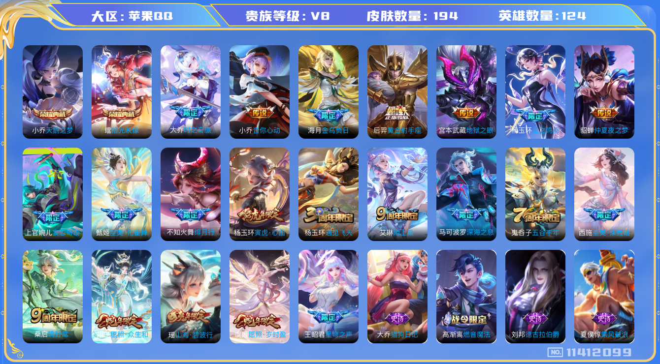 [11412099]V8 2典藏 16传说 124英雄 194皮肤 可修改实名 优质装备:天鹅之梦(小乔典藏),拾光映像(瑶典藏),黄金射手座,仲夏夜之梦(大飞蛾),音你心动-小乔,地狱之眼,妄想奇谈,大乔-时之奇旅,金乌负日 传说皮:星之鸣奏 珍宝阁皮:妄想食味 限定皮:愿照·岁时盈(虞姬年限),愿照·众生和(妲己年限),陌上桑,鸣野蒿,星穹之声,绯月行,山海·碧波行(瑶年限),至美·乘鲤谣,至美·化雀舞,遇见飞天,五谷丰年,寅虎·心曲(虎婆),深海之息(深海大菠萝) 史诗皮:赞萌露比,瑰影绮梦,化蝶舞,茶境仙,蒙犽顽岩魄,琥珀纪元伽罗,夜落电台,蔬乡物语(鲁班七号),紫霞仙子,特工魅影,江河有灵,魅语,高渐离燃音魔法,冰冠公主,青蛇,偶像歌手,晚萤,暗夜猫娘,银翎春语,末日机甲-吕布,猫狗日记-大乔,时之恋人-孙尚香,节奏热浪,女仆咖啡,摇滚巨星,水果甜心,绅士熊喵,天才门将,星夜王子,心灵骇客,时之奇旅-安琪拉,德古拉伯爵,暗隐猎兽者,幽灵船长,鬼剑武藏,舞动绿茵,诗语江南,乘风破浪,逐浪之夏,水晶猎龙者,曙光守护者,唤灵魅影,金属风暴,原初追逐者,鹰眼统帅,魅力维加斯,黎明之约