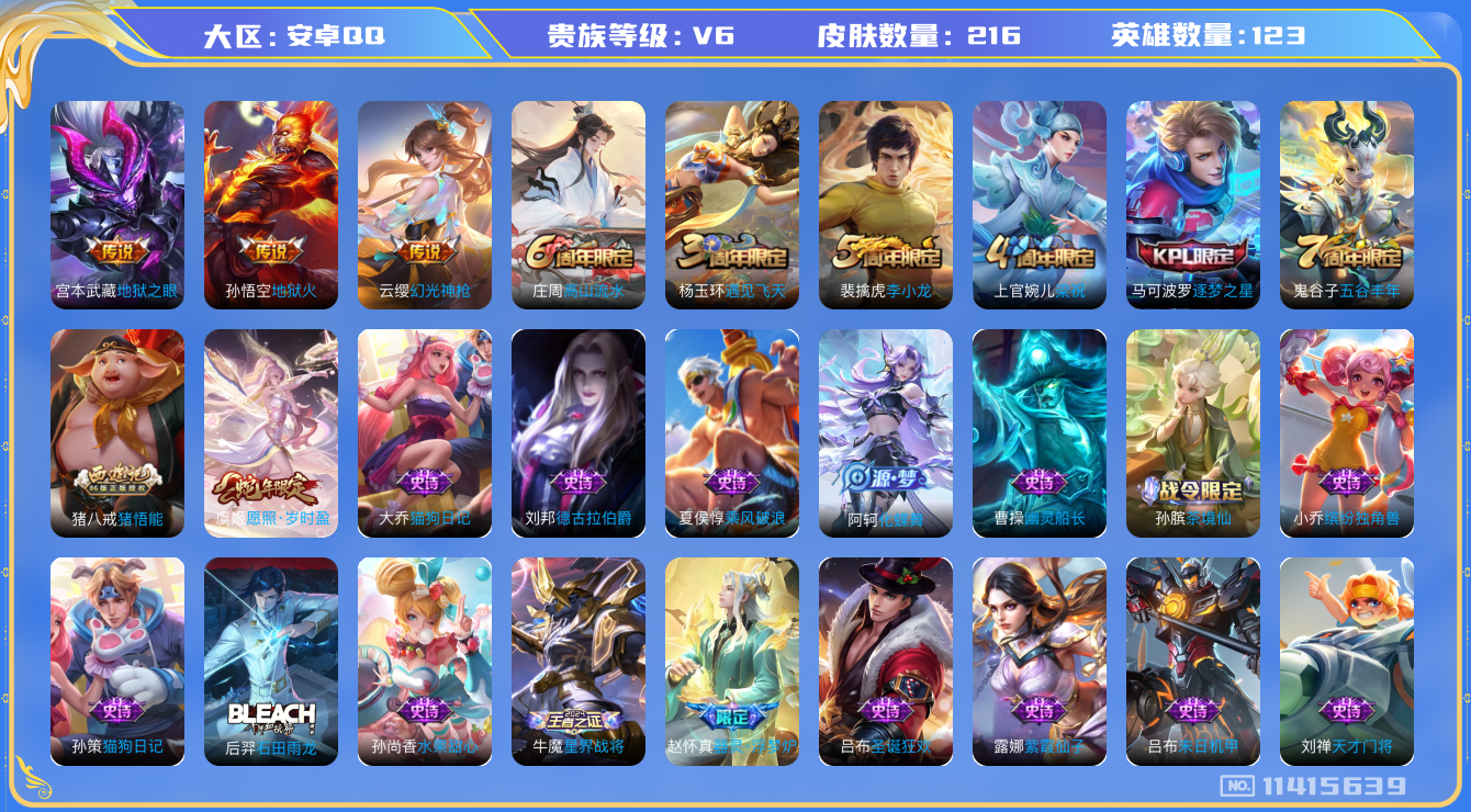 [11415639]V6 4传说 123英雄 216皮肤 可修改实名 优质装备:地狱火,地狱之眼 传说皮:幻光神枪 珍宝阁皮:妄想食味,蔷薇恋人 限定皮:愿照·岁时盈(虞姬年限),遇见飞天,高山流水,五谷丰年,梁祝,逐梦之星,李小龙,猪悟能 史诗皮:苍鳞隐世,器灵·浮梦炉,化蝶舞,星界战将,石田雨龙,茶境仙,紫霞仙子,特工魅影,末日机甲-吕布,猫狗日记-孙策,猫狗日记-大乔,水果甜心,天才门将,德古拉伯爵,幽灵船长,鬼剑武藏,缤纷独角兽,乘风破浪,水晶猎龙者,金属风暴,原初追逐者,圣诞狂欢,鹰眼统帅,魅力维加斯,赏金猎手,未来纪元-赵云