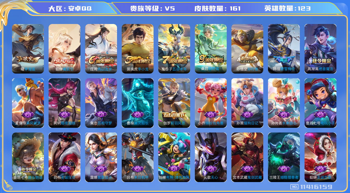 [11416159]V5 3传说 123英雄 161皮肤 可修改实名 女号 优质装备:李逍遥 传说皮:貂蝉曦玄引 珍宝阁皮:蔷薇恋人,玩趣恶龙 限定皮:鸣野蒿,傲雪梅枪,高山流水,五谷丰年,李小龙,孙行者 史诗皮:蔬乡物语(鲁班七号),百相守梦-黄忠,紫霞仙子,电玩小子(小书包),特工魅影,高渐离燃音魔法,蒙恬荣光圣徽,电玩·爆裂旋风,暗夜猫娘,末日机甲-吕布,猫狗日记-孙策,摇滚巨星,水果甜心,心灵骇客,暗隐猎兽者,幽灵船长,鬼剑武藏,舞动绿茵,诗语江南,缤纷独角兽,乘风破浪,热力回旋,箭羽风息,金属风暴,圣诞狂欢,圣诞恋歌,鹰眼统帅,魅力维加斯,无心