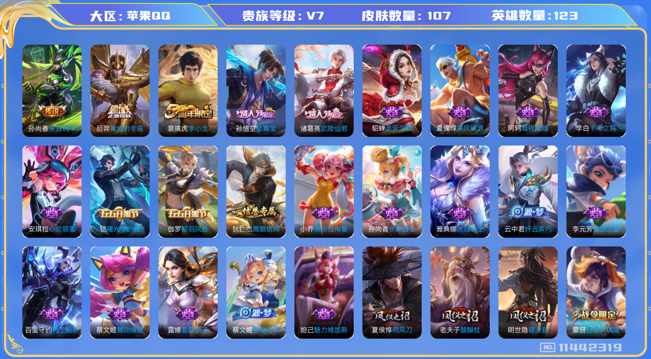 [11442319]V7 3传说 123英雄 107皮肤 可修改实名 优质装备:黄金射手座,末日机甲-孙尚香(绿蚂蚱) 限定皮:至尊宝,武陵仙君(小桃花),李小龙 史诗皮:紫霞仙子,特工魅影,千年之狐,冰冠公主,暗夜猫娘,水果甜心,心灵骇客,舞动绿茵,纤云弄巧,繁星吟游(呼啦呼啦),缤纷独角兽,乘风破浪,逐浪之夏,曙光守护者,箭羽风息,圣诞恋歌,鹰眼统帅,魅力维加斯