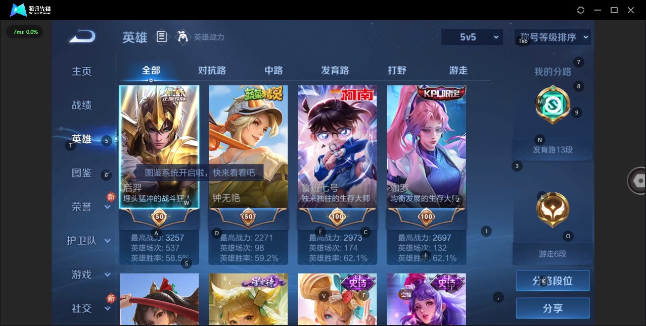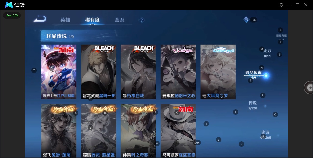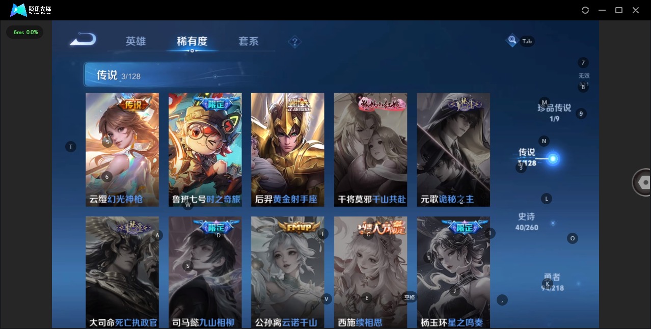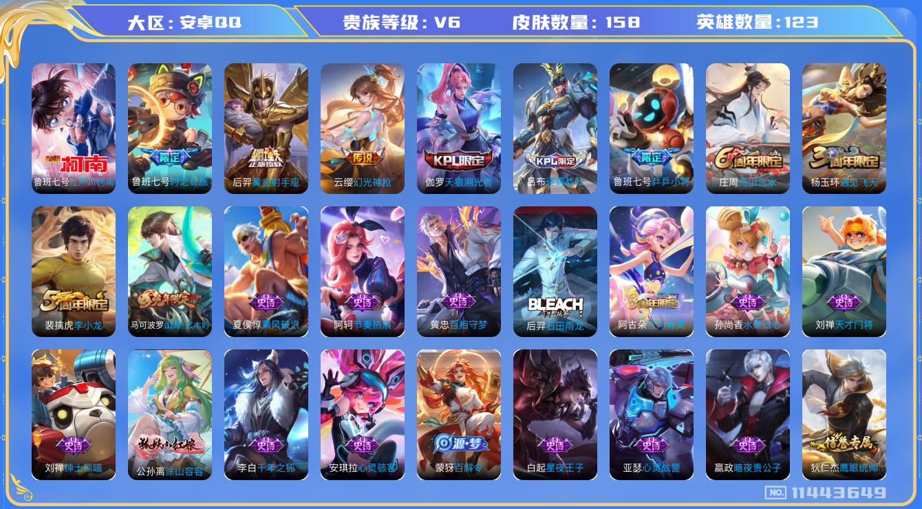 [11443649]V6 1珍品传说 3传说 123英雄 158皮肤 可修改实名 女号 优质装备:江户川柯南,黄金射手座,鲁班七号-时之奇旅,涂山容容 传说皮:幻光神枪 珍宝阁皮:妄想食味,玩趣恶龙 限定皮:逐霄战戟,遇见飞天,高山流水,天狼溯光者,李小龙,乒乒小将,山海·玄木吟(马可年限) 史诗皮:石田雨龙,百相守梦-黄忠,千年之狐,江河有灵,百解令(蒙犽),偶像歌手,节奏热浪,女仆咖啡,水果甜心,绅士熊喵,天才门将,星夜王子,心灵骇客,心灵战警,舞动绿茵,纤云弄巧,繁星吟游(呼啦呼啦),乘风破浪,逐浪之夏,金属风暴,鹰眼统帅,暗夜贵公子,未来纪元-赵云