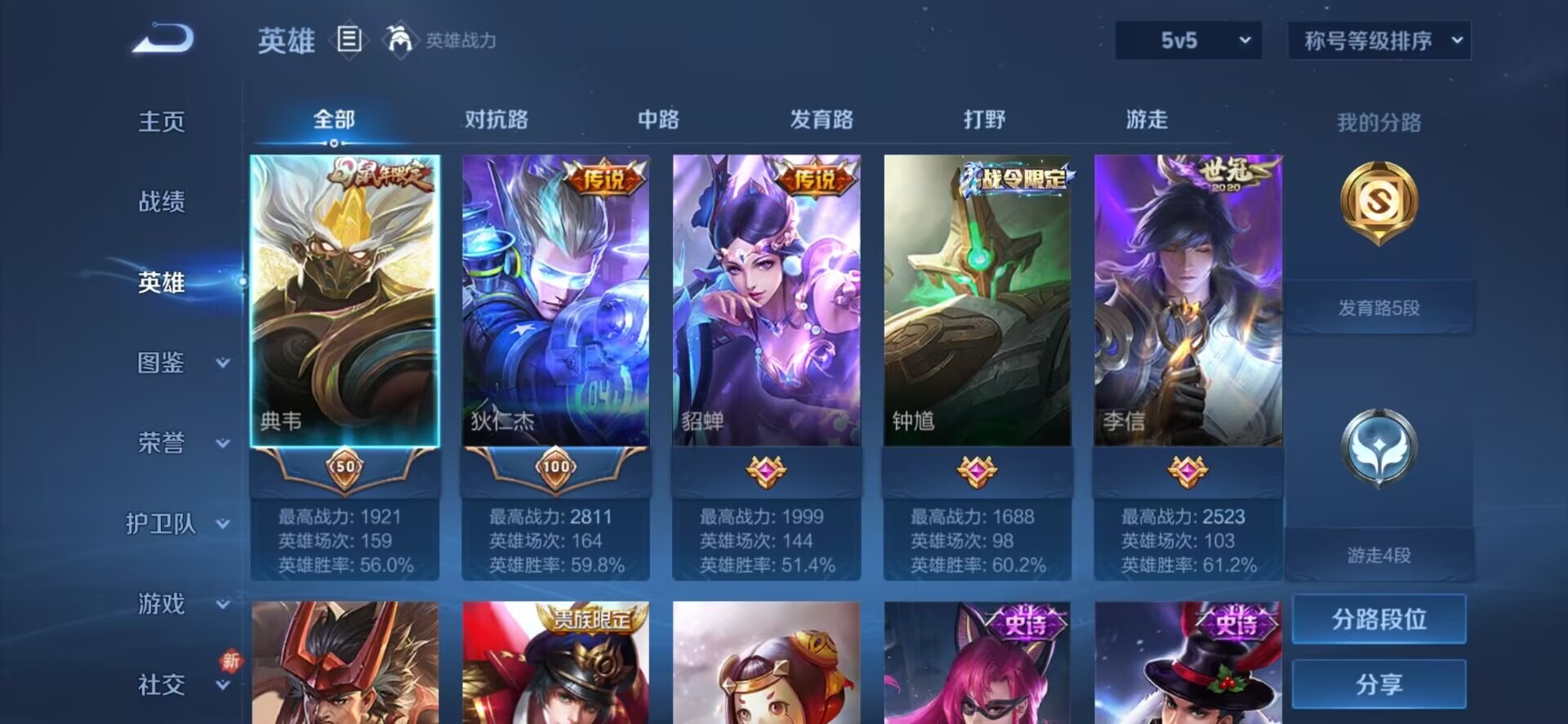 - PX_2057222-贵族等级: V7 英雄数: 124 皮肤数: 252 星传说: 零号·雷霆 传说皮: 黄金射手座,绛天战甲,久胜战神,炽阳神光,一念神魔,零号·赤焰,淬星耀世,超时空战士-狄仁杰,澜逐花归海,乘龙·铭钟鼎,乘龙·淬吴钩,牧神诗旅,云诺千山 限定皮: 遇见飞天,李小龙,梁祝,岱宗,神威,青龙志,高山流水,五谷丰年,山海·玄木吟,鸣野蒿