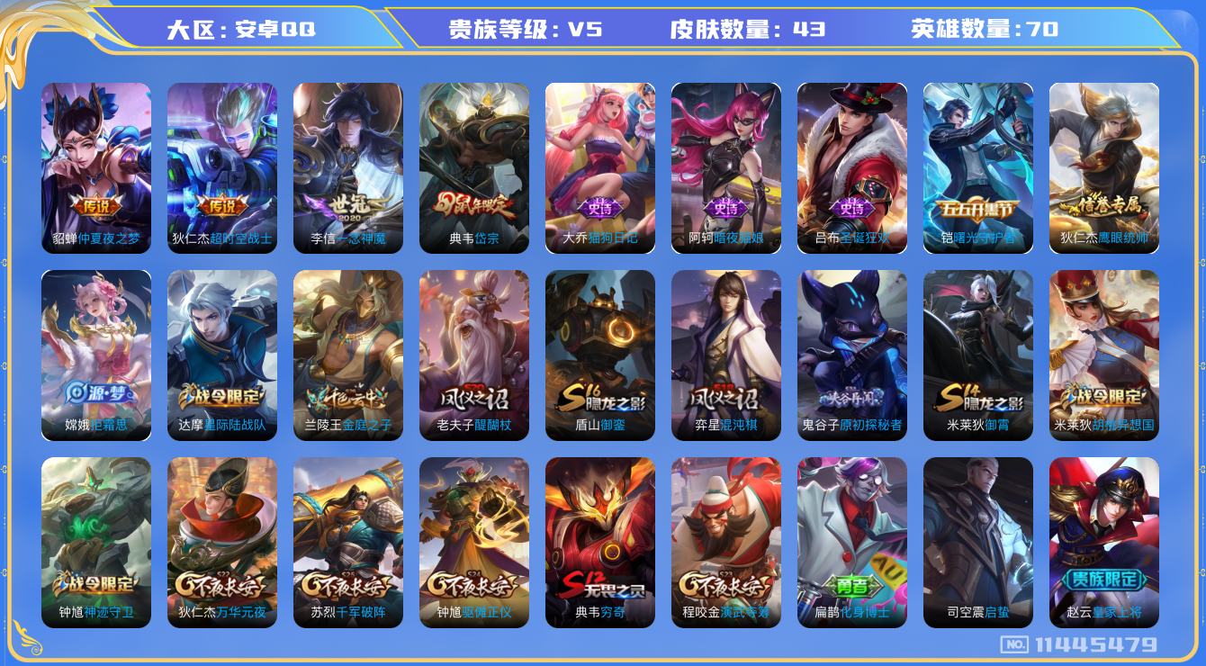 [11445479]V5 3传说 70英雄 43皮肤 可修改实名 优质装备:一念神魔,仲夏夜之梦(大飞蛾),超时空战士-狄仁杰 限定皮:岱宗(典韦年限) 史诗皮:暗夜猫娘,猫狗日记-大乔,拒霜思,曙光守护者,圣诞狂欢,鹰眼统帅