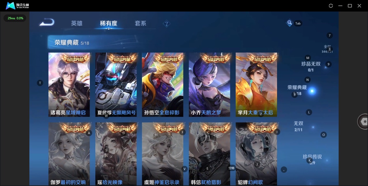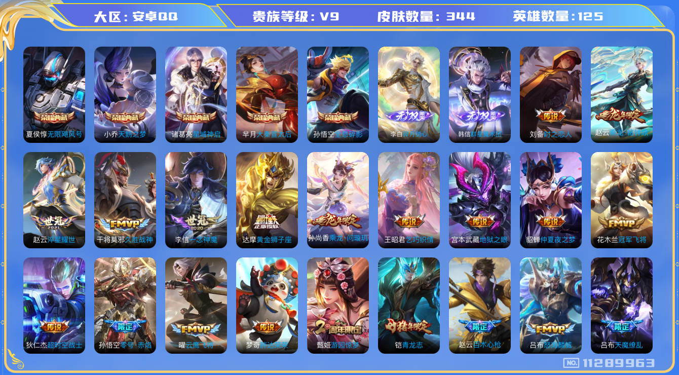[11289963]V9 5典藏 2无双 23传说 125英雄 344皮肤 可修改实名 荣耀水晶:全息碎影(猴子典藏),天鹅之梦(小乔典藏),无限飓风号(高达),星域神启(倪克斯贼亮),大秦宣太后 无双皮:韩信群星魔术团(韩信无双),碎月剑心(李白无双) 传说皮:乘龙·问璇玑(孙尚香年限),乘龙·铭钟鼎(赵云年限),黄金狮子座,零号·赤焰,仲夏夜之梦(大飞蛾),地狱之眼,一念神魔,淬星耀世,冠军飞将,久胜战神,云鹰飞将(小将军),胖达荣荣,乞巧织情,时之恋人-刘备(电焊工),超时空战士-狄仁杰 珍宝阁皮:妄想食味,优雅恋人,玩趣恶龙 限定皮:鸣野蒿,至尊宝,凤求凰(白切鸡),傲雪梅枪,遇见飞天,高山流水,诗剑行,怒海麟威,五谷丰年,青龙志(铠年限),冰锋战神,游园惊梦,梁祝,天狼绘梦者,李小龙,天魔缭乱,青春决赛季,匿光追影者,寅虎·赤拳(老虎年限),百木心枪,玉兔公主,深海之息(深海大菠萝) 史诗皮:星界战将,鸭鸭历险记-刘禅,灵蛊蚀心,百相守梦-百里守约,百相守梦-黄忠,蔬乡物语(鲁班七号),紫霞仙子,苍穹之光,电玩小子(小书包),白龙吟,黄金分割率,特工魅影,千年之狐,永昼,江河有灵,冰冠公主,偶像歌手,晚萤,无限星赏官,魅语,电玩·爆裂旋风,龙骑士(小龙虾),末日机甲-吕布,猫狗日记-孙策,猫狗日记-大乔,时之恋人-孙尚香,乱世虎臣,节奏热浪,修罗,女仆咖啡,摇滚巨星,水果甜心,绅士熊喵,天才门将,星夜王子,心灵骇客,时之奇旅-安琪拉,功夫厨神,德古拉伯爵,暗隐猎兽者,幽灵船长,鬼剑武藏,心灵战警,乐园奇幻夜,天秀·启明,舞动绿茵,地狱岩魂,诗语江南,纤云弄巧,繁星吟游(呼啦呼啦),拒霜思,缤纷独角兽,乘风破浪,逐浪之夏,月团寄思,水晶猎龙者,曙光守护者,热力回旋,箭羽风息,金属风暴,圣诞狂欢,圣诞恋歌,鹰眼统帅,暗夜贵公子,魅力维加斯,黎明之约,赏金猎手,未来纪元-赵云