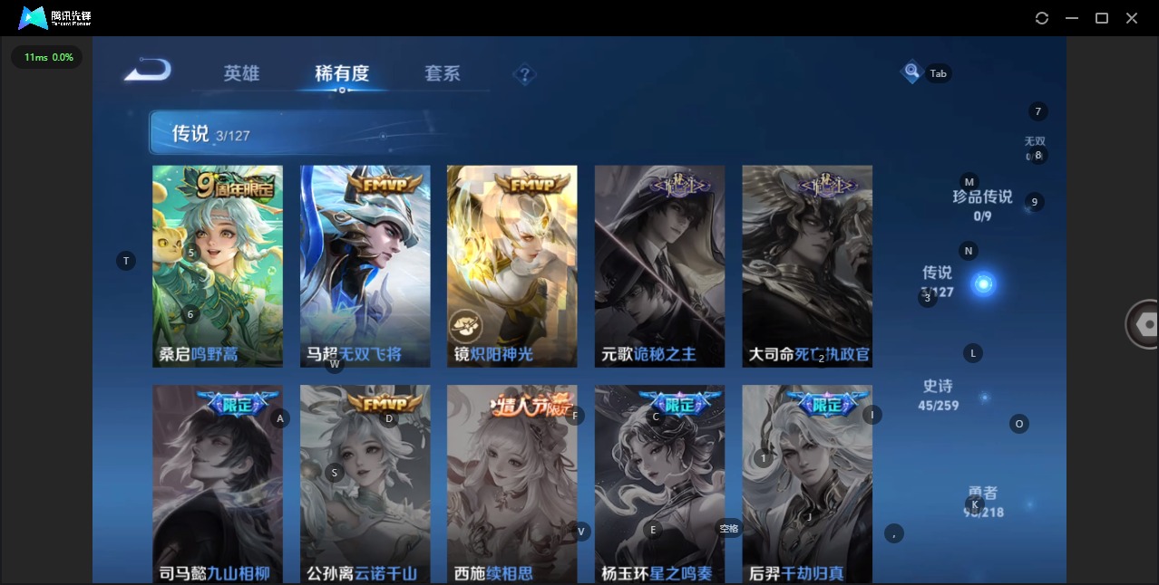 - [11515160]V5 5传说 123英雄 149皮肤 可修改实名 优质装备:黄金射手座,炽阳神光 传说皮:幻光神枪 珍宝阁皮:蔷薇恋人,女武神 限定皮:鸣野蒿,五谷丰年,寅虎·赤拳(老虎年限) 史诗皮:器灵·浮梦炉,百相守梦-黄忠,紫霞仙子,黄金分割率,电玩·爆裂旋风,江河有灵,高渐离燃音魔法,蒙恬荣光圣徽,晚萤,末日机甲-吕布,猫狗日记-孙策,乱世虎臣,节奏热浪,水果甜心,绅士熊喵,暗隐猎兽者,幽灵船长,鬼剑武藏,纤云弄巧,繁星吟游(呼啦呼啦),水晶猎龙者,曙光守护者,金属风暴,鹰眼统帅,魅力维加斯,黎明之约