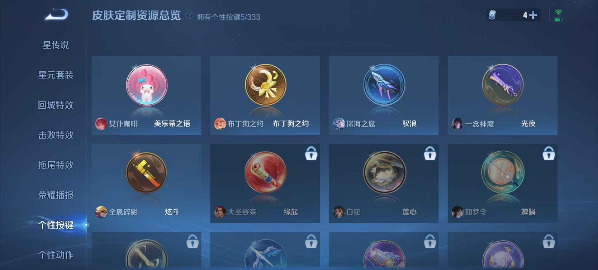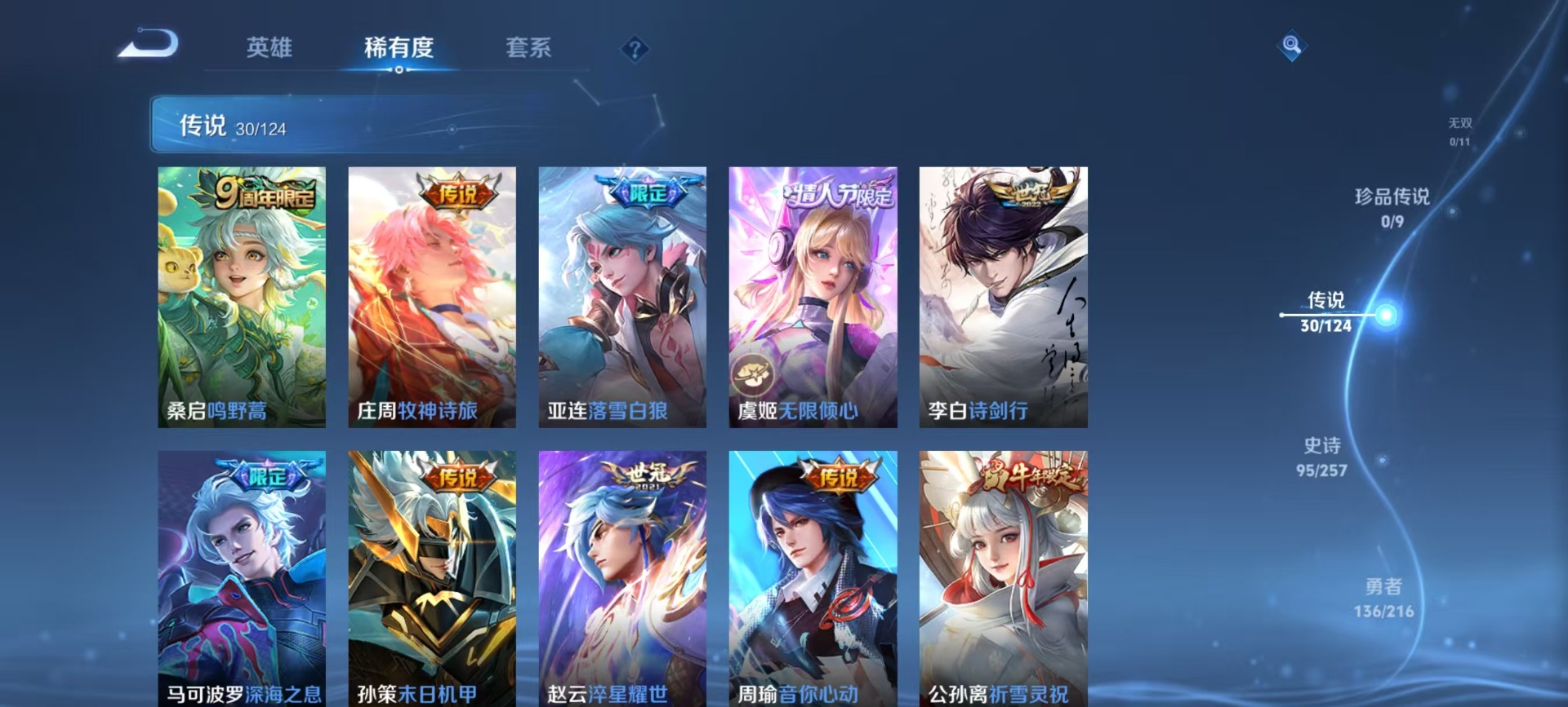 廉颇寅虎·御盾,吕布御风骁将,后羿如梦令,镜匿光追影者,周瑜真爱至上,诸葛亮时雨天司,公孙离祈雪灵祝,裴擒虎李小龙,上官婉儿梁祝,李白诗剑行,花木兰默契交锋,马可波罗深海之息,桑启鸣野蒿,猪八戒猪悟能,孙悟空大圣娶亲,孙悟空至尊宝,马超神威,云中君时之祈愿,韩信傲雪梅枪,韩信飞衡,虞姬霸王别姬,关羽武圣