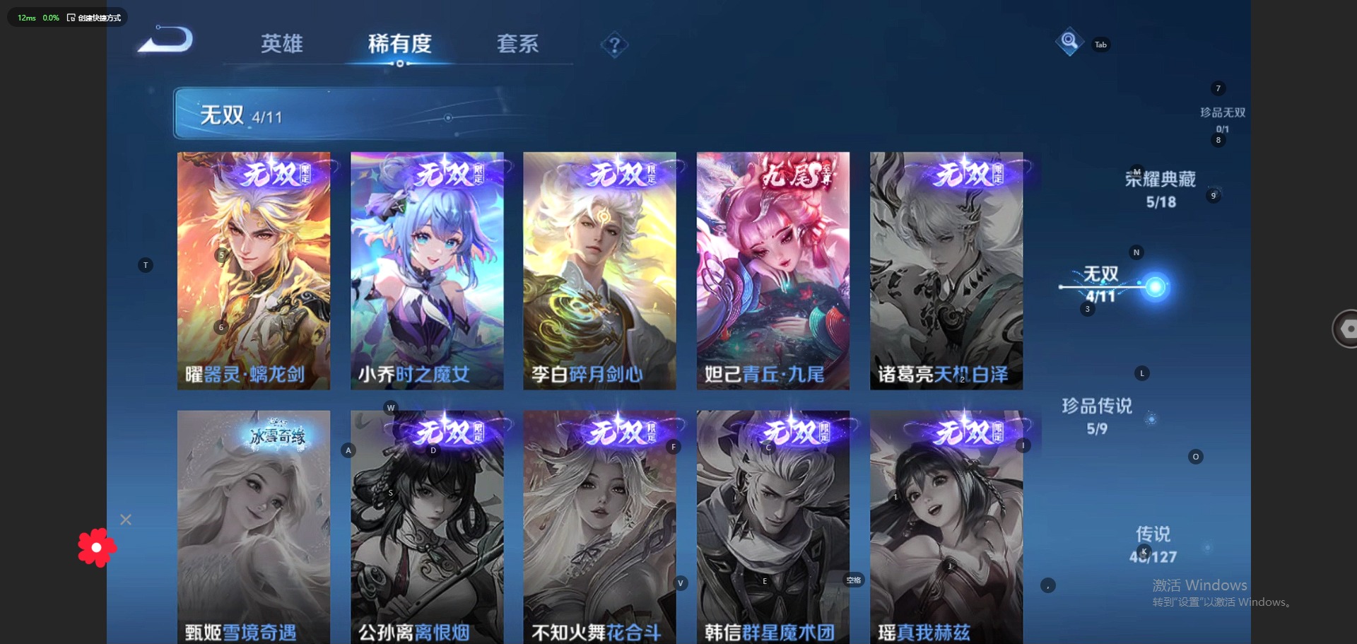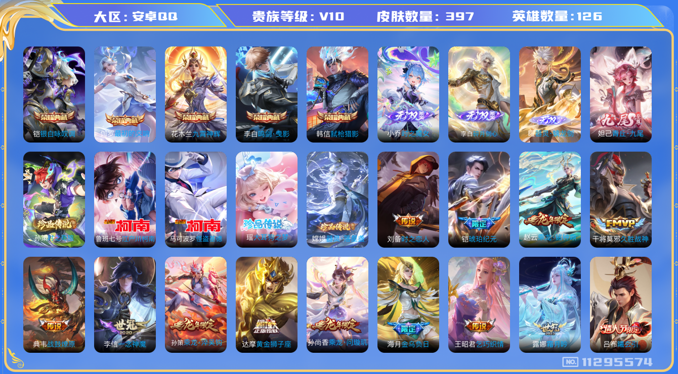 [11295574]V10 5典藏 4无双 5珍品传说 48传说 126英雄 397皮肤 典藏英雄武则天 可修改实名 优质装备:鸣剑·曳影,九霄神辉(木兰典藏),银白咏叹调(倪克斯侍卫),弑枪猎影(韩信典藏),青丘·九尾(妲己无双),碎月剑心(李白无双),小乔时之魔女(小乔无双),器灵·螭龙剑,最初的交响(伽罗典藏),江户川柯南,怪盗基德,器灵·落星盏,大耳狗之梦,黄金狮子座,黄金射手座,云鹰飞将(小将军),久胜战神,炽阳神光,一念神魔,海洋之心,飞鸢探春,李逍遥,乞巧织情,时之恋人-刘备(电焊工),超时空战士-狄仁杰,碎云,记忆之芯(机甲兔),青丘·九尾,惊梅引,霜月吟,艾琳觅芳踪,琥珀纪元铠,琥珀纪元马超,金乌负日,黄金天蝎座 珍品传说:时之奇旅-孙策 传说皮:乘龙·问璇玑(孙尚香年限),乘龙·铭钟鼎(赵云年限),乘龙·淬吴钩(孙策年限),貂蝉曦玄引,吕布曦玄引,典韦战鼓燎原,落雪白狼,云诺千山,续相思,星之鸣奏,幻光神枪 珍宝阁皮:妄想食味,优雅恋人,玩趣恶龙 限定皮:愿照·九州拓(澜年限),愿照·福禄聚(蔡文姬年限),愿照·岁时盈(虞姬年限),愿照·山河定(司空震年限),愿照·众生和(妲己年限),愿照·千秋盛(女娲年限),逐霄战戟,映山客,陌上桑,鸣野蒿,夏侯惇霜北刀,凤求凰(白切鸡),武陵仙君(小桃花),寅虎·展翼(孙膑年限),白晶晶,时雨天司(水龙头),高山流水,诗剑行,怒海麟威,五谷丰年,青龙志(铠年限),幽恒(沐浴露),烈魂,李小龙,辉光之辰,奇迹圣诞,孙行者,大圣娶亲,寅虎·赤拳(老虎年限) 史诗皮:赞萌露比,鸭鸭历险记-刘禅,器灵·浮梦炉,糖绘人间,狼魂孤将,绮世丹青,化蝶舞,星界战将,灵蛊蚀心,龙之律动,雪豹·霜爪,小牛鸭,石田雨龙,百相守梦-周瑜,戍鼓铭心,茶境仙,破空之剑,埋骨钱,芈月浮光幕影,谪仙醉月,决胜骁骑,上官婉儿群星魔术团,蔬乡物语(鲁班七号),曹操夜都魔契,超元猎域,乘龙·聚宝船(安琪拉年限),乘龙·忆丹青(大乔年限),琥珀纪元伽罗,百相守梦-百里守约,百相守梦-黄忠,紫霞仙子,苍穹之光,电玩小子(小书包),黄金分割率,特工魅影,千年之狐,永昼,完美假期,真我赫兹(百里守约),末日机甲-莱西奥,百解令(蒙犽),高渐离燃音魔法,偶像歌手,龙骑士(小龙虾),白蛇,暗夜猫娘,魅语,无限星赏官,晚萤,青蛇,末日机甲-吕布,猫狗日记-孙策,猫狗日记-大乔