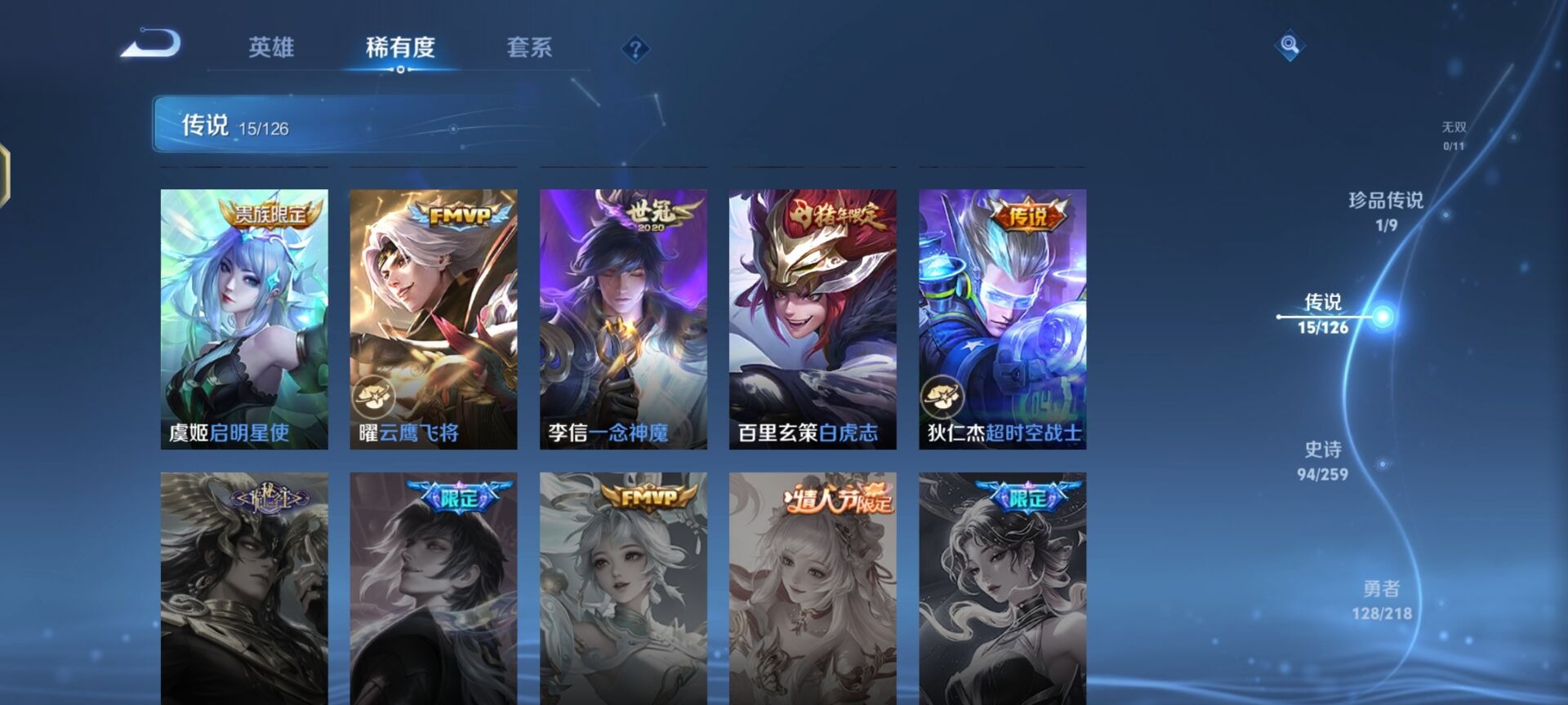 大乔猫狗日记,高渐离天秀·音浪,高渐离燃音魔法,刘邦德古拉伯爵,夏侯惇乘风破浪,阿轲暗夜猫娘,阿轲节奏热浪,铠曙光守护者,曹操幽灵船长,伽罗箭羽风息,廉颇地狱岩魂,小乔缤纷独角兽,小乔青蛇,孙尚香时之恋人,孙策猫狗日记,吕布圣诞狂欢,露娜紫霞仙子,吕布末日机甲,镜玫瑰异探,诸葛亮黄金分割率,刘禅天才门将,刘禅绅士熊喵,宫本武藏鬼剑武藏,公孙离无限星赏官,兰陵王暗隐猎兽者,貂蝉圣诞恋歌,花木兰水晶猎龙者,李白千年之狐,安琪拉心灵骇客,白起星夜王子,亚瑟心灵战警,嬴政摇滚巨星,嬴政暗夜贵公子,程咬金功夫厨神,雅典娜冰冠公主,雅典娜黎明之约,百里守约特工魅影,李元芳逐浪之夏,墨子金属风暴,蔡文姬舞动绿茵,澜赏金猎手,嫦娥拒霜思