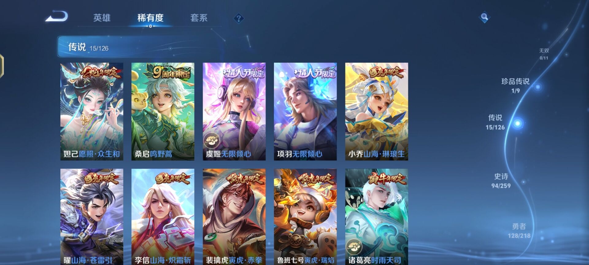 - [11530040]V8 1典藏 17传说 123英雄 362皮肤 可修改实名 荣耀水晶:鸣剑·曳影 传说皮:吕布曦玄引,幻光神枪,山海·炽霜斩(李信年限),黄金射手座,地狱之眼,末日机甲-孙尚香(绿蚂蚱),一念神魔,久胜战神,炽阳神光,超时空战士-狄仁杰,妄想实况 珍宝阁皮:妄想食味,优雅恋人,蔷薇恋人,女武神 限定皮:逐霄战戟,鸣野蒿,至尊宝,白虎志(电光耗子),凤求凰(白切鸡),时雨天司(水龙头),神威(电光马子),遇见飞天,诗剑行,五谷丰年,青龙志(铠年限),梁祝,御风骁将(吕布年限),李小龙,孙行者,大圣娶亲 史诗皮:星界战将,谪仙醉月,鸭鸭历险记-刘禅,灵蛊蚀心,石田雨龙,百相守梦-百里守约,蒙犽顽岩魄,怒海争锋,蔬乡物语(鲁班七号),化蝶舞,破空之剑,紫霞仙子,电玩小子(小书包),白龙吟,黄金分割率,特工魅影,千年之狐,江河有灵,蒙恬荣光圣徽,冰冠公主,青蛇,偶像歌手,晚萤,电玩·爆裂旋风,末日机甲-吕布,猫狗日记-孙策,猫狗日记-大乔,乱世虎臣,节奏热浪,女仆咖啡,摇滚巨星,水果甜心,绅士熊喵,天才门将,星夜王子,心灵骇客,时之奇旅-安琪拉,功夫厨神,德古拉伯爵,暗隐猎兽者,幽灵船长,鬼剑武藏,心灵战警,天秀·启明,舞动绿茵,地狱岩魂,纤云弄巧,繁星吟游(呼啦呼啦),拒霜思,缤纷独角兽,乘风破浪,逐浪之夏,水晶猎龙者,箭羽风息,金属风暴,原初追逐者,圣诞狂欢,圣诞恋歌,鹰眼统帅,暗夜贵公子,魅力维加斯,黎明之约,无心,未来纪元-赵云