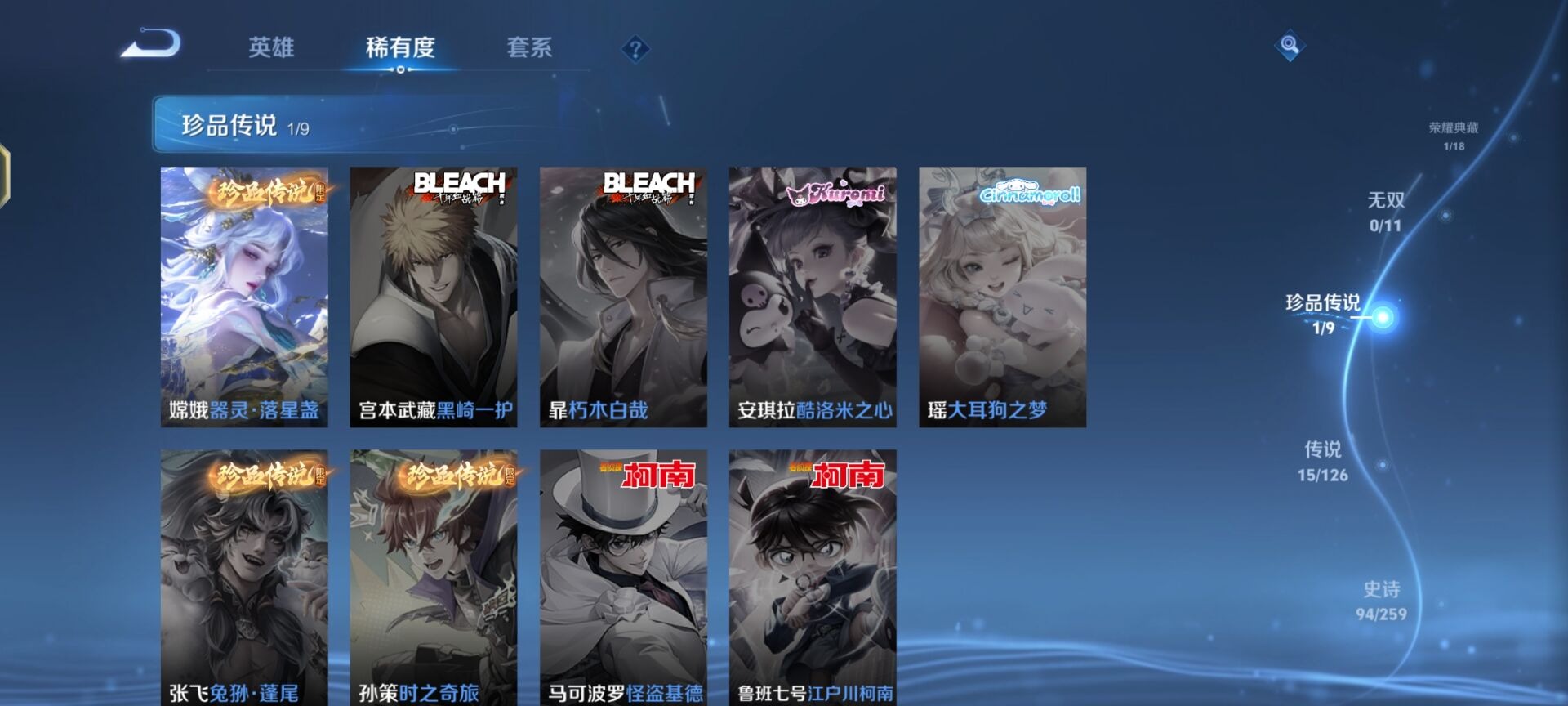 刘邦夺宝奇兵,老夫子醍醐杖,沈梦溪星空之诺,沈梦溪大漠名商,苏烈千军破阵,达摩沙漠行僧,元歌云间偶戏,兰陵王金庭之子,裴擒虎擒涛扼浪,鲁班大师探海日志,明世隐疑决卦,蒙犽狂想玩偶喵,马可波罗暗影游猎,鬼谷子原初探秘者,张良古海寻踪,桑启海盐诗旅,狄仁杰万华元夜,程咬金演武夺筹,李元芳银河之约,李元芳云中旅人,弈星混沌棋,钟馗驱傩正仪