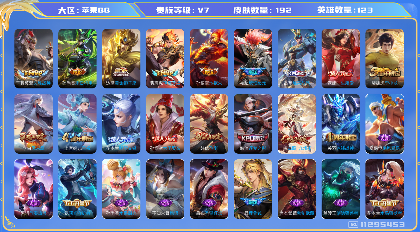 - PX_2078074-实名: 可修改 贵族等级: V7 英雄数: 124 皮肤数: 265 传说皮: 云霓雀翎,末日机甲-孙尚香,超时空战士-狄仁杰,无双飞将,记忆之芯,乘龙·问璇玑,幻光神枪 限定皮: 遇见飞天,李小龙,祈雪灵祝,游园惊梦,梁祝,白晶晶,逐梦之翼,逐梦之星,凤求凰,美猴王,青龙志,如梦令-后羿,高山流水,玉兔公主,五谷丰年,逐霄战戟,愿照·岁时盈