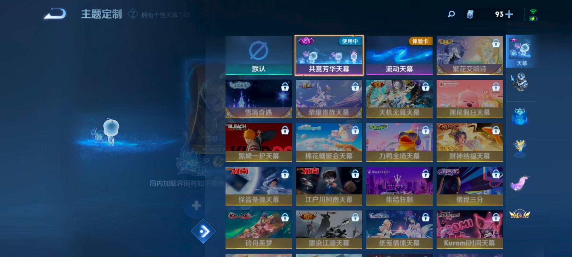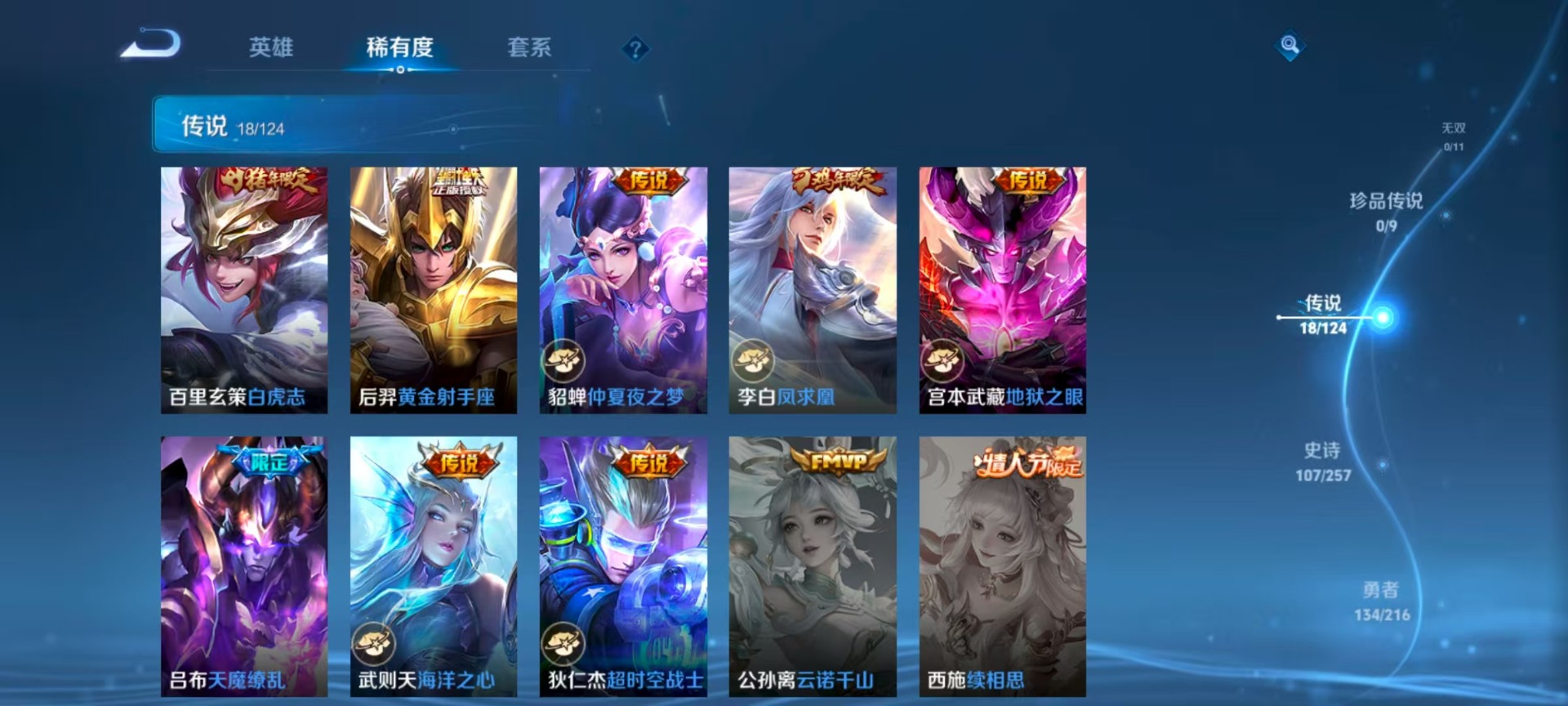 伽罗太华,孙膑天狼运算者,干将莫邪冰霜恋舞曲,小乔纯白花嫁,项羽霸王别姬,吕布御风骁将,后羿辉光之辰,露娜一生所爱,诸葛亮时雨天司,公孙离祈雪灵祝,裴擒虎梅西,裴擒虎李小龙,上官婉儿梁祝,花木兰青春决赛季,桑启鸣野蒿,猪八戒猪悟能,孙悟空大圣娶亲,芈月白晶晶,孙悟空至尊宝,百里玄策白虎志,马超神威,韩信逐梦之影,关羽冰锋战神
