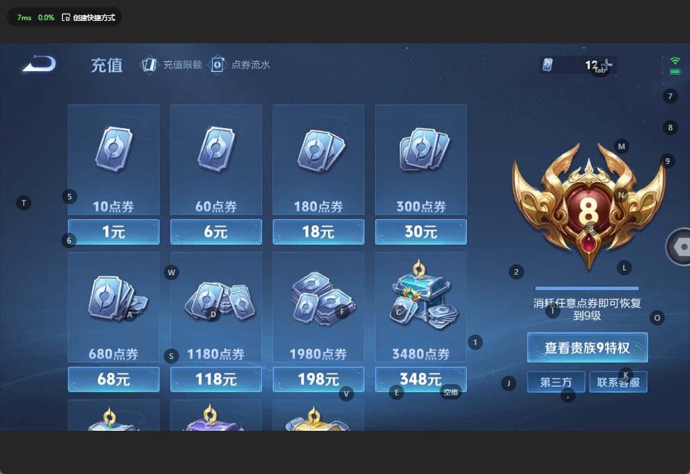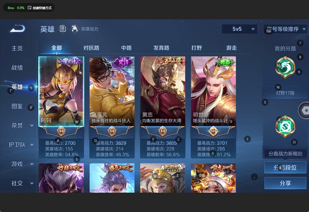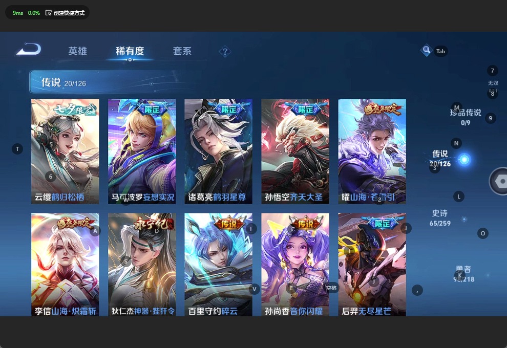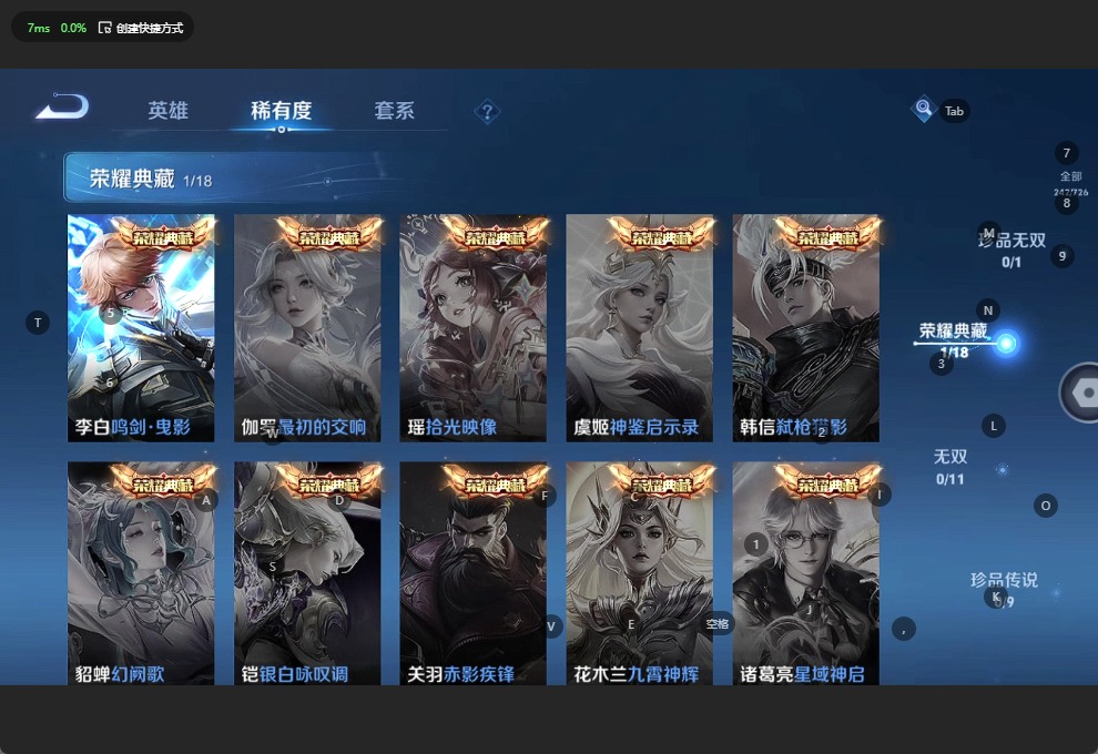 - [11709987]V7 8传说 122英雄 134皮肤 可修改实名 嬴政大国标 关羽小国标 苍小国标 优质装备:冠军飞将,云鹰飞将(小将军) 传说皮:乘龙·铭钟鼎(赵云年限),乘龙·淬吴钩(孙策年限),落雪白狼 珍宝阁皮:优雅恋人 限定皮:逐霄战戟,鸣野蒿,白虎志(电光耗子),白鹤梁神女,遇见飞天,武圣,梁祝,李小龙 史诗皮:怒海争锋,决胜骁骑,特工魅影,千年之狐,江河有灵,龙骑士(小龙虾),乱世虎臣,修罗,摇滚巨星,水果甜心,鬼剑武藏,缤纷独角兽,月团寄思,原初追逐者,鹰眼统帅,暗夜贵公子,魅力维加斯,黎明之约