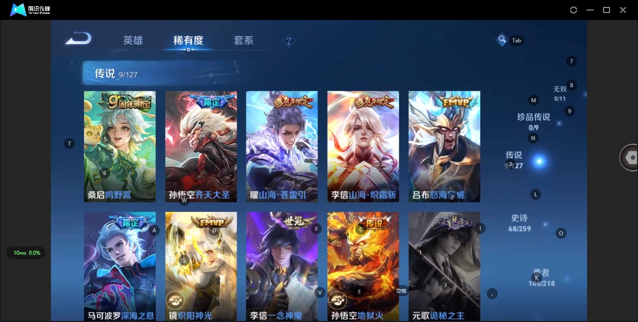 - PX_2096181-57 安卓QQ/永恒钻石/186皮肤/124英雄/1典藏/0珍品无双/0无双/2珍品传说/11传说/35史诗/9稀有英雄 【2 珍品传说】朽木白哉 暃,黑崎一护 宫本武藏, 【1 典藏皮肤】鸣剑·曳影 李白, 【11 传说皮肤】无双飞将 马超,云鹰飞将 曜,诗剑行 李白,燃星之曲 花木兰,地狱之眼 宫本武藏,鹤羽星尊 诸葛亮,战鼓燎原 典韦,超时空战士 狄仁杰,愿照·众生和