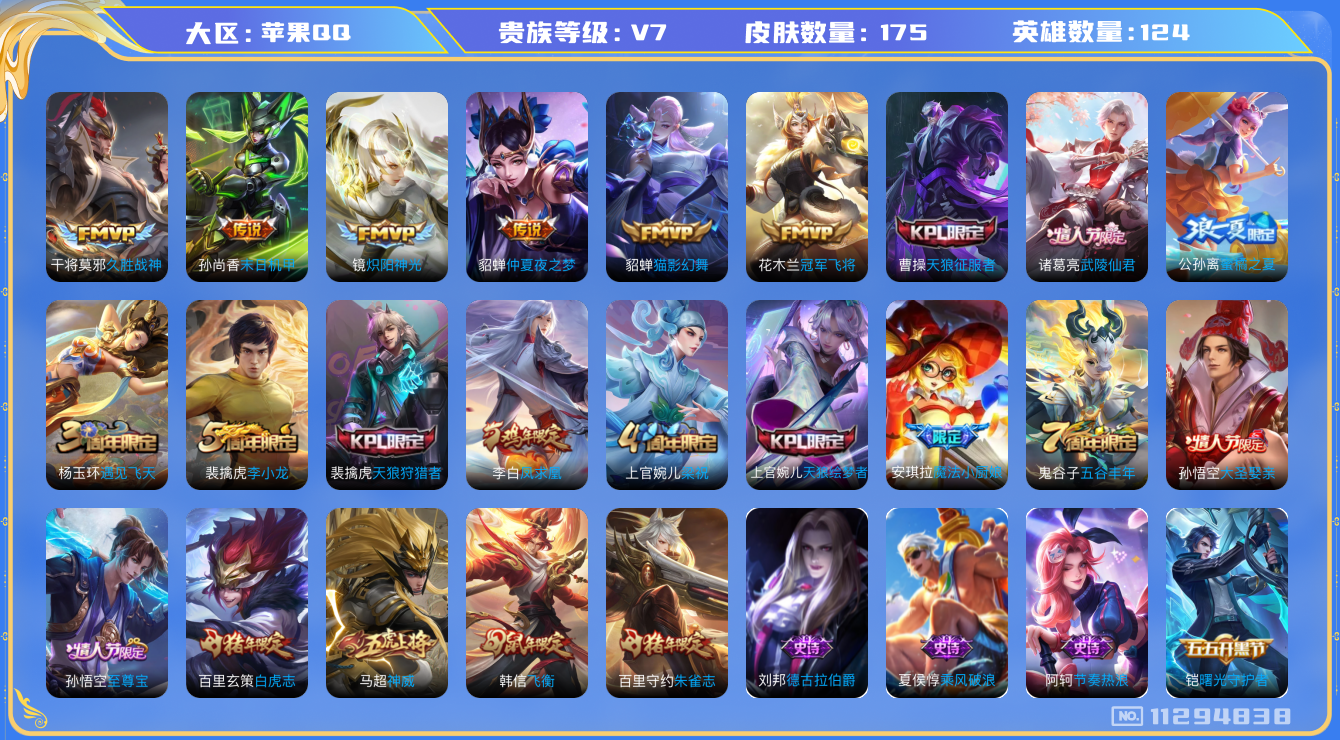 [11294838]V7 9传说 124英雄 175皮肤 可修改实名 优质装备:冠军飞将,猫影幻舞,久胜战神,炽阳神光,末日机甲-孙尚香(绿蚂蚱),仲夏夜之梦(大飞蛾) 珍宝阁皮:优雅恋人 限定皮:至尊宝,白虎志(电光耗子),凤求凰(白切鸡),武陵仙君(小桃花),魔法小厨娘,神威(电光马子),飞衡(韩信年限),遇见飞天,五谷丰年,梁祝,天狼狩猎者,天狼征服者,天狼绘梦者,李小龙,朱雀志(守约年限),大圣娶亲,蜜橘之夏 史诗皮:紫霞仙子,黄金分割率,特工魅影,千年之狐,无限星赏官,末日机甲-吕布,节奏热浪,摇滚巨星,水果甜心,天才门将,星夜王子,心灵骇客,德古拉伯爵,幽灵船长,鬼剑武藏,地狱岩魂,繁星吟游(呼啦呼啦),缤纷独角兽,乘风破浪,曙光守护者,箭羽风息,金属风暴,原初追逐者,圣诞狂欢,圣诞恋歌,鹰眼统帅,魅力维加斯,未来纪元-赵云