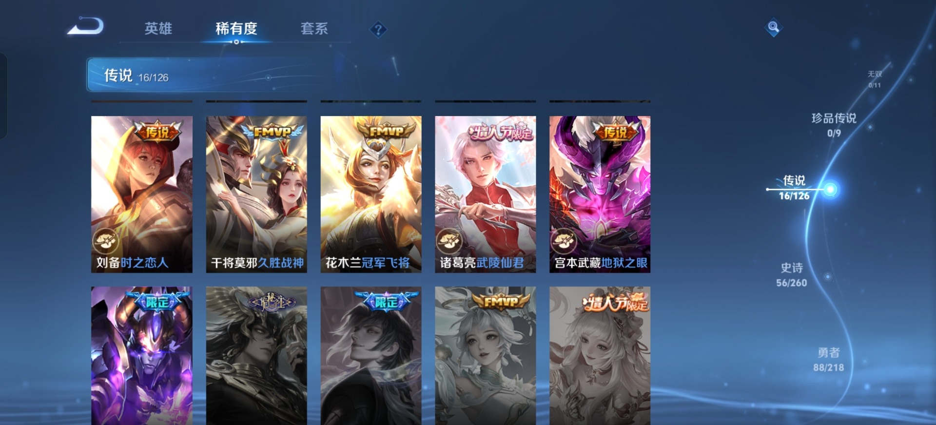 [11296955]V8 2典藏 16传说 124英雄 201皮肤 可修改实名 优质装备:全息碎影(猴子典藏),九霄神辉(木兰典藏),冠军飞将,久胜战神,一念神魔,地狱之眼,李逍遥,时之恋人-刘备(电焊工),神器·狴犴令,山海·炽霜斩(李信年限),山海·苍雷引(电光曜子),画中仙,追逃游戏(亚瑟) 珍宝阁皮:优雅恋人,玩趣恶龙 限定皮:凤凰于飞,武陵仙君(小桃花),绯月行,时之彼端,白晶晶,时雨天司(水龙头),五谷丰年,梁祝,逐梦之音,李小龙,如梦令-后羿,默契交锋-花木兰,孙行者,天魔缭乱,神奇女侠,神器·万象笔,山海·玄木吟(马可年限) 史诗皮:苍穹之光,电玩小子(小书包),黄金分割率,永昼,龙骑士(小龙虾),冰冠公主,猫狗日记-孙策,时之恋人-孙尚香,修罗,女仆咖啡,水果甜心,星夜王子,功夫厨神,德古拉伯爵,暗隐猎兽者,幽灵船长,鬼剑武藏,纤云弄巧,繁星吟游(呼啦呼啦),拒霜思,缤纷独角兽,乘风破浪,金属风暴,原初追逐者,圣诞狂欢,鹰眼统帅,魅力维加斯,黎明之约,赏金猎手,无心,未来纪元-赵云