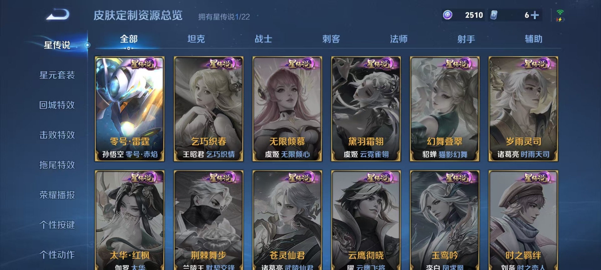 刘邦德古拉伯爵,夏侯惇乘风破浪,阿轲节奏热浪,铠曙光守护者,曹操幽灵船长,伽罗箭羽风息,孙策猫狗日记,赵怀真器灵·浮梦炉,鲁班七号电玩小子,吕布圣诞狂欢,露娜紫霞仙子,吕布末日机甲,刘禅电玩·爆裂旋风,刘禅天才门将,刘禅绅士熊喵,宫本武藏鬼剑武藏,公孙离无限星赏官,兰陵王暗隐猎兽者,花木兰水晶猎龙者,安琪拉心灵骇客,白起星夜王子,亚瑟心灵战警,嬴政摇滚巨星,雅典娜黎明之约,李元芳逐浪之夏,百里守约特工魅影,墨子龙骑士,墨子金属风暴,王昭君偶像歌手