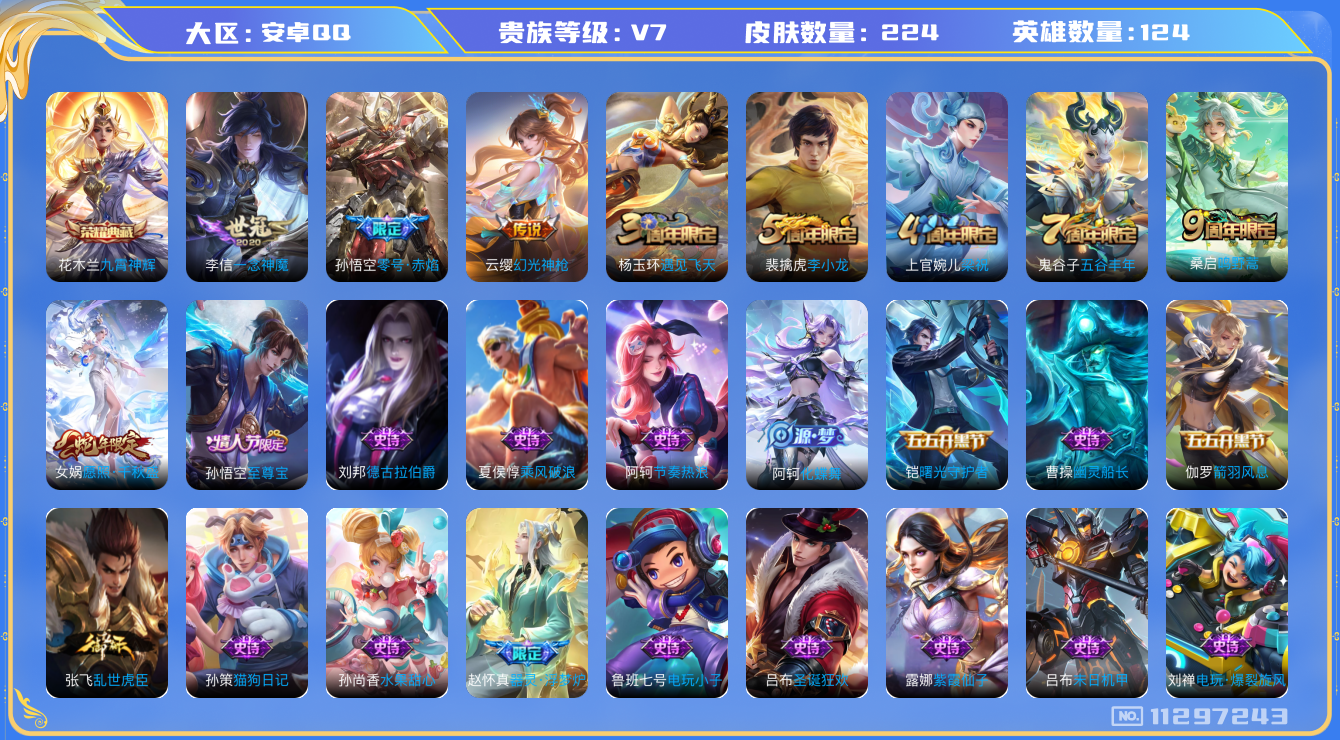 - PX_2099117-实名: 可修改 贵族等级: V1 英雄数: 104 皮肤数: 77 限定皮: 五谷丰年,齐天大圣