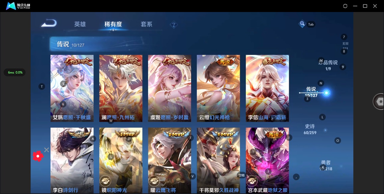 - [11517910]V5 6传说 103英雄 94皮肤 可修改实名 优质装备:地狱之眼,记忆之芯(机甲兔) 传说皮:云诺千山 珍宝阁皮:蔷薇恋人 限定皮:愿照·九州拓(澜年限),愿照·山河定(司空震年限),鸣野蒿,李小龙 史诗皮:器灵·浮梦炉,糖绘人间,星界战将,紫霞仙子,千年之狐,偶像歌手,末日机甲-吕布,猫狗日记-大乔,女仆咖啡,水果甜心,功夫厨神,鬼剑武藏,纤云弄巧,逐浪之夏,水晶猎龙者,鹰眼统帅