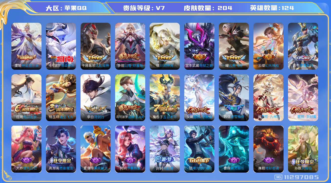 [11297085]V7 1典藏 1珍品传说 10传说 124英雄 204皮肤 可修改实名 优质装备:神鉴启示录,怪盗基德,云鹰飞将(小将军),久胜战神,炽阳神光,地狱之眼,山海·炽霜斩(李信年限) 传说皮:幻光神枪 珍宝阁皮:妄想食味 限定皮:愿照·九州拓(澜年限),愿照·岁时盈(虞姬年限),愿照·千秋盛(女娲年限),逐霄战戟,傲雪梅枪,遇见飞天,高山流水,诗剑行,五谷丰年,山海·玄木吟(马可年限) 史诗皮:鸭鸭历险记-刘禅,器灵·浮梦炉,化蝶舞,龙之律动,茶境仙,东方月初,百相守梦-百里守约,紫霞仙子,黄金分割率,电玩·爆裂旋风,江河有灵,百解令(蒙犽),高渐离燃音魔法,蒙恬荣光圣徽,偶像歌手,冰冠公主,末日机甲-吕布,猫狗日记-大乔,节奏热浪,修罗,女仆咖啡,水果甜心,绅士熊喵,天才门将,星夜王子,功夫厨神,暗隐猎兽者,幽灵船长,鬼剑武藏,心灵战警,地狱岩魂,拒霜思,乘风破浪,逐浪之夏,水晶猎龙者,曙光守护者,金属风暴,原初追逐者,圣诞狂欢,圣诞恋歌,鹰眼统帅,赏金猎手,未来纪元-赵云
